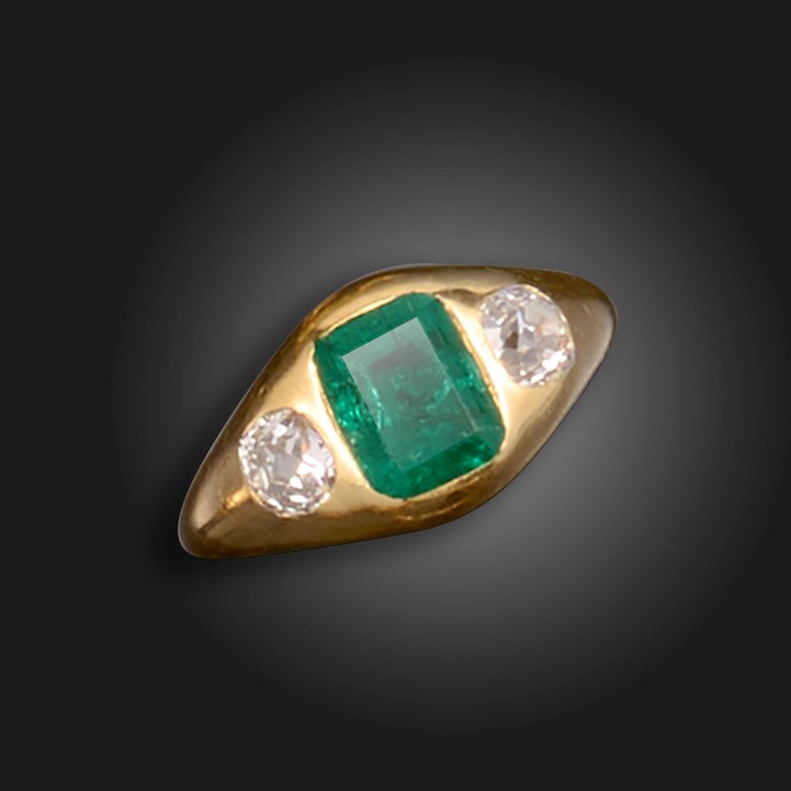 An emerald and diamond three-stone ring