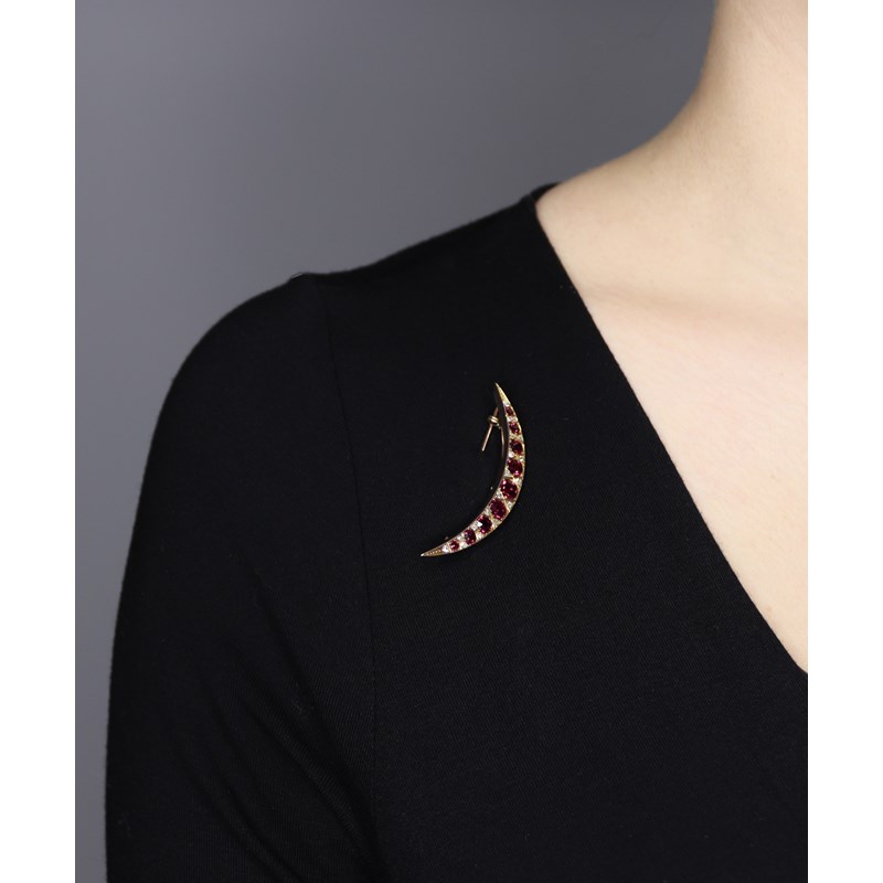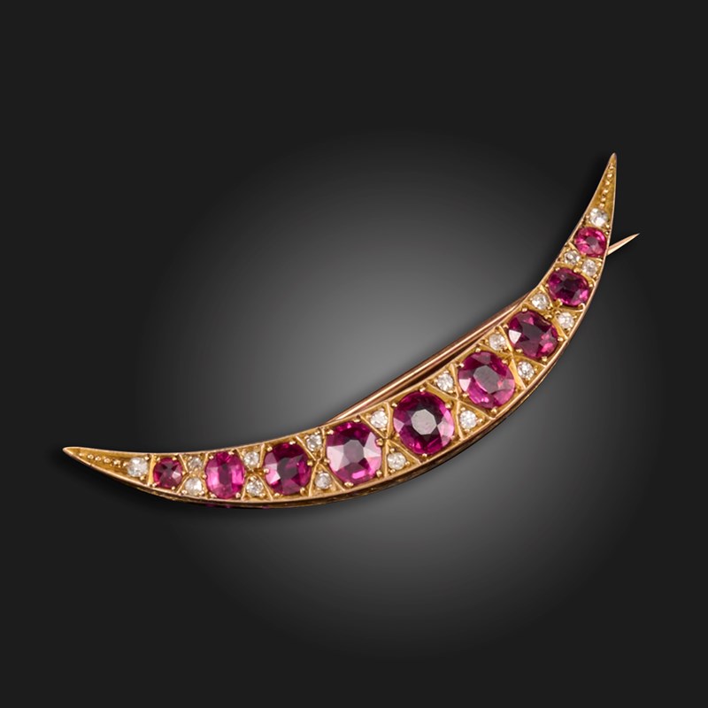 A late Victorian ruby and diamond crescent brooch, set with graduated cushion-shaped rubies and old single-cut diamonds in gold, 5cm wide, fitted case