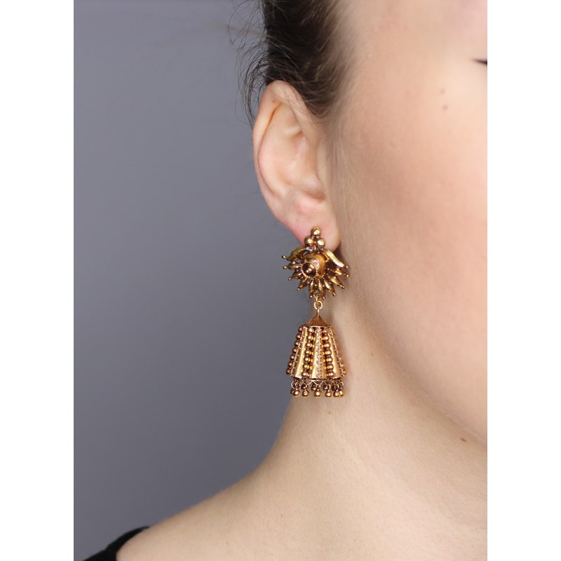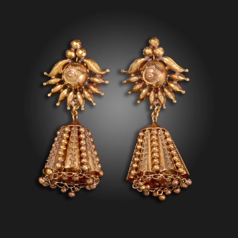 A pair of late 19th century gold drop earrings, possibly Indian, the conical-shaped bodies with pellet decoration and suspending ball pendants, with scrolling gold upper sections, 26cm high, centre opening case from Calcutta