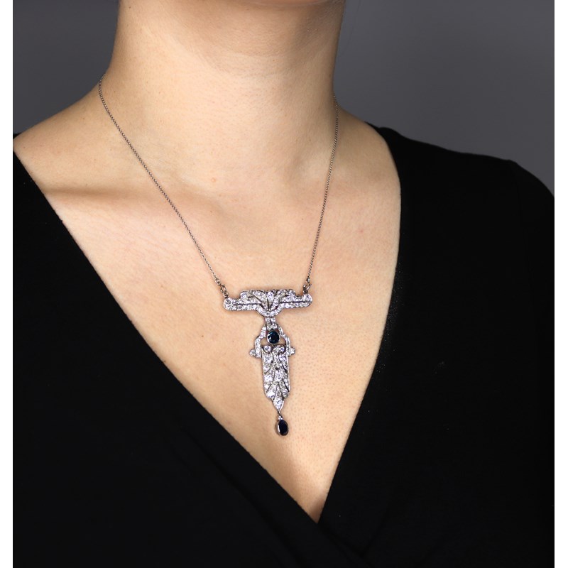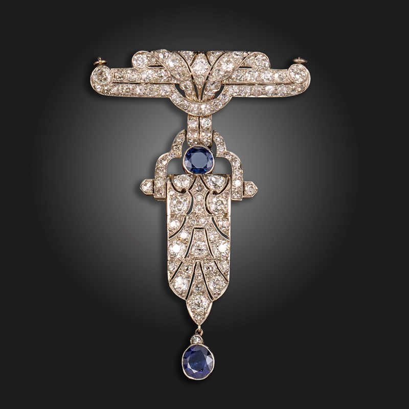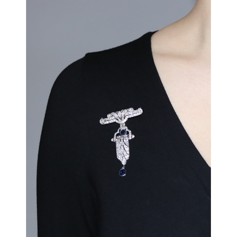 An Art Deco diamond and sapphire brooch pendant, the brooch of bar and scroll design, set overall with graduated circular-cut diamonds, suspending a flexible diamond-set pendant with two circular-cut sapphires in platinum, 6.3cm high