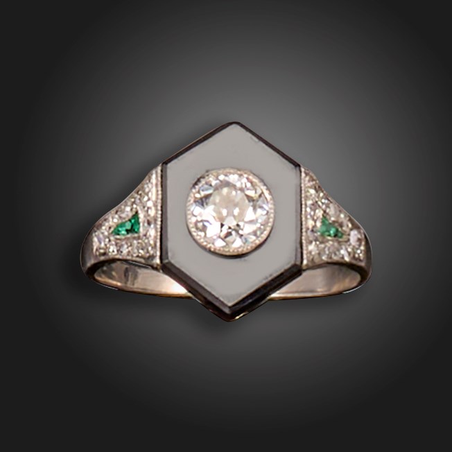 An Art Deco onyx, diamond and emerald ring, the hexagonal onyx plaque is centred with an old circular-cut diamond weighing approximately 0.30cts, the shoulders set with single-cut diamonds and calibre-cut emeralds in platinum, size J