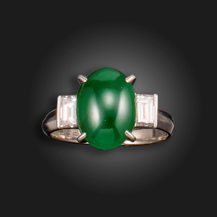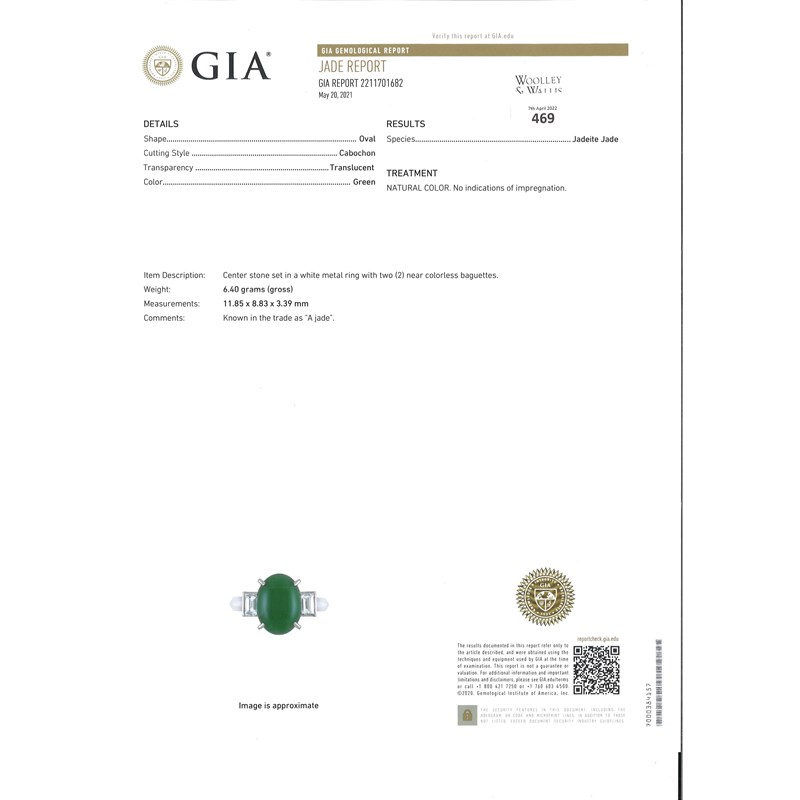 Accompanied by report number 2211701682 dated 20 May 2021 from GIA stating that the green jade cabochon is natural jadeite jade with no indications of treatment.