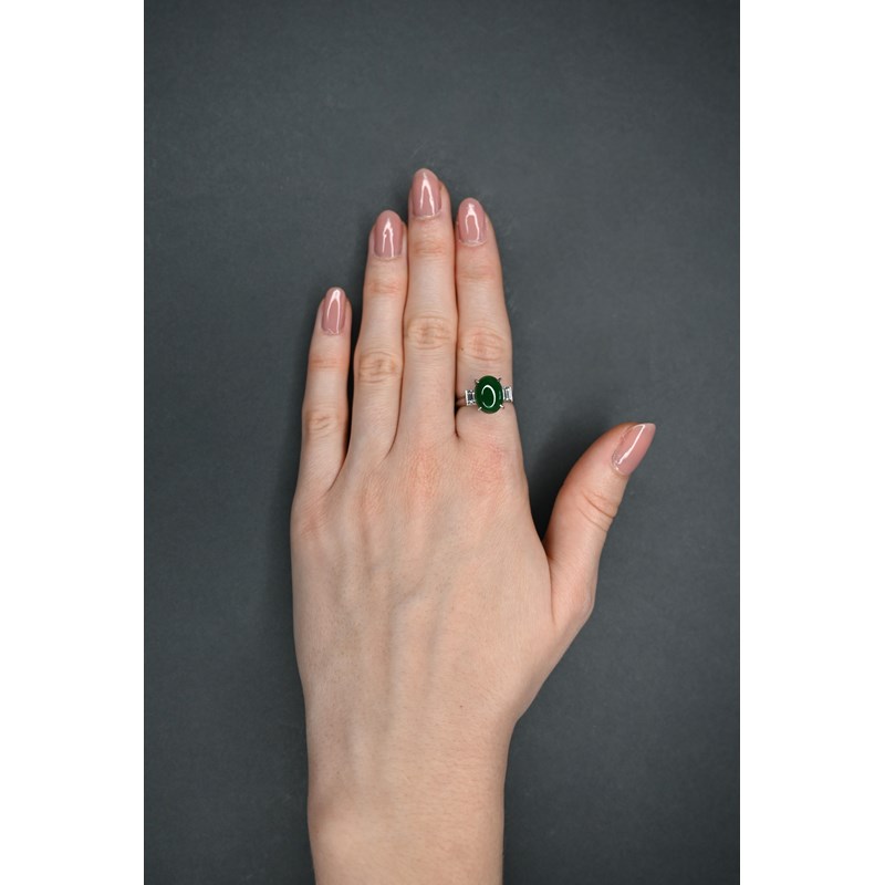 A jade and diamond three-stone ring, the jade cabochon is set with a baguette-shaped diamond to each shoulder in platinum, size N
