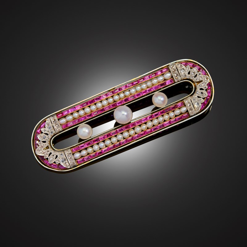 An early 20th century natural pearl, ruby and diamond brooch by Chaumet, the oval brooch centred with three natural pearls within a surround of calibre-cut rubies and seed pearls with white enamel border, with rose-cut diamond-set foliate terminals in platinum and gold, French control marks and maker's mark for Joseph Chaumet, 5.6cm long fitted Chaumet case