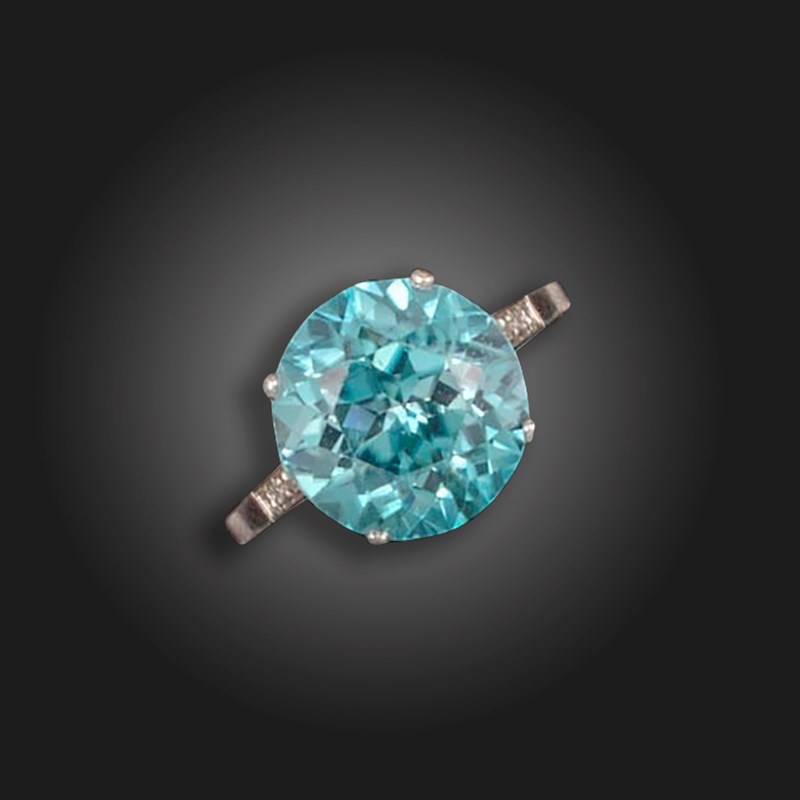 An early 20th century zircon and diamond ring, the circular-cut blue zircon is set with three single-cut diamonds to each shoulder in platinum, size M 1/2