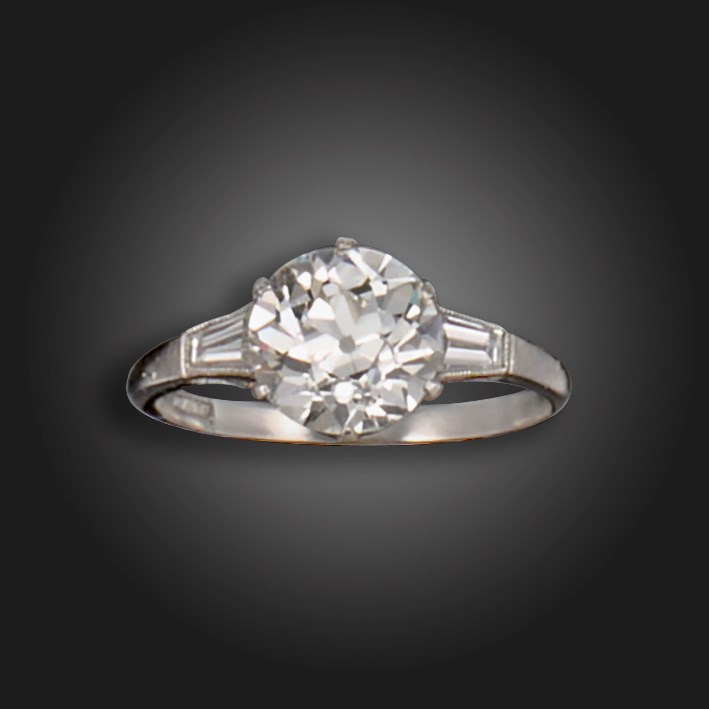 A diamond solitaire ring, the old circular-cut diamond weighs approximately 2.00cts, set with a tapered baguette-shaped diamond to each shoulder in platinum, size N