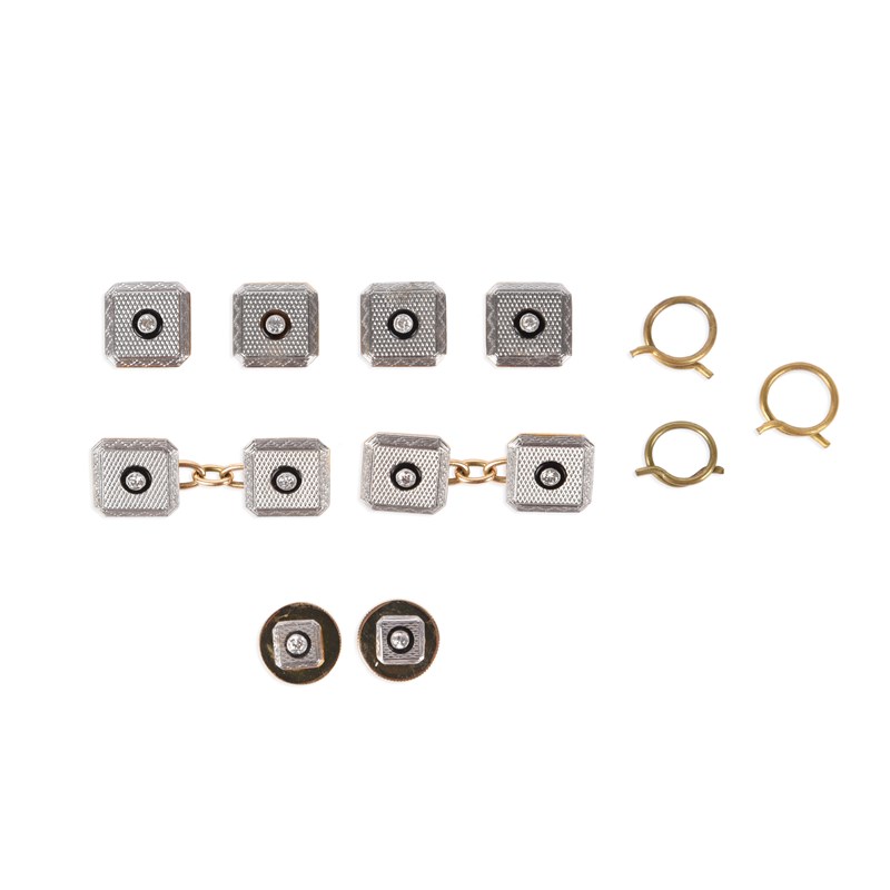A set of early 20th century square-form dress cufflinks and studs, centred with a circular-cut diamond in a black onyx surround, with engine-turned decoration in platinum and gold, fitted case by Asprey
