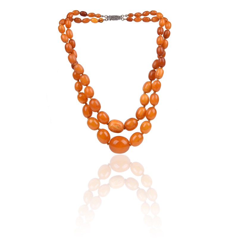 A two-row amber bead necklace, the oval beads graduate from 0.7 - 3cm, 53cm long, 92g