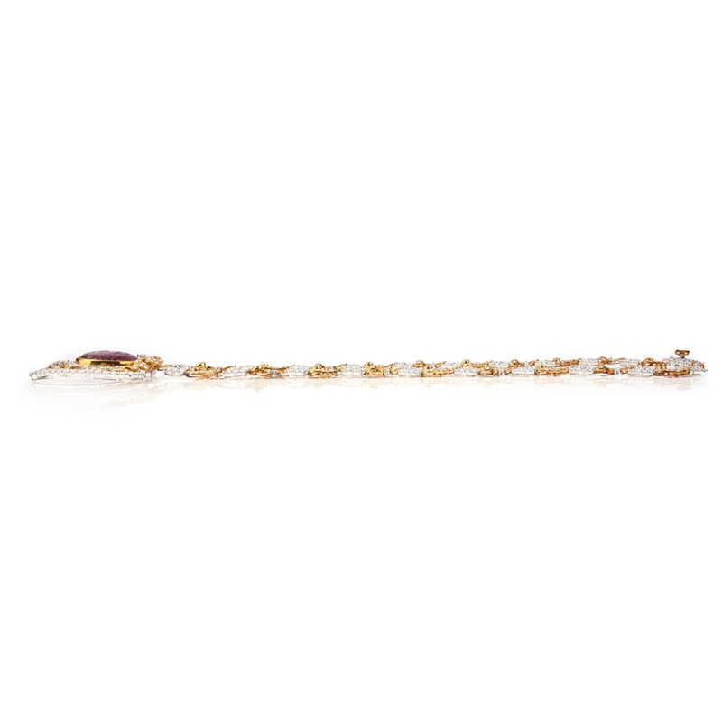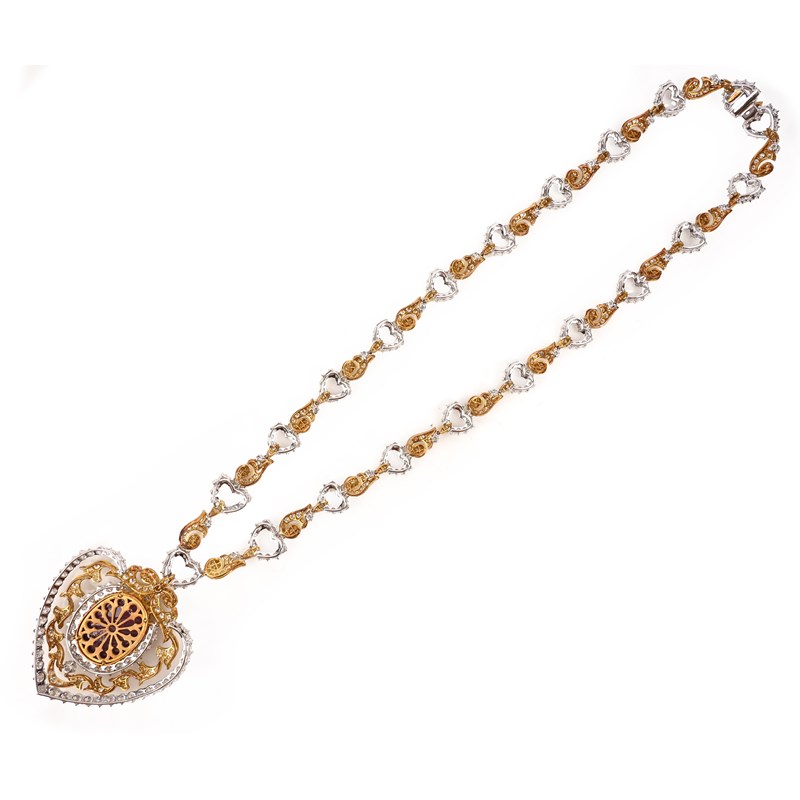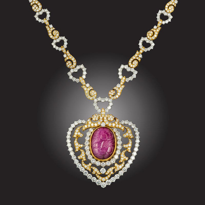 A large ruby and diamond pendant necklace, the pendant centred with a carved ruby decorated with a floral motif, within an elaborate border of round brilliant-cut diamonds in white and yellow gold, the chain formed of alternating heart-shaped and scrolling links in white and yellow gold, all set with round brilliant cut diamonds, signed Prologo, stamped 750, gross weight 148g, pendant length 7cm, chain length 62cm