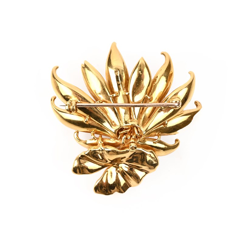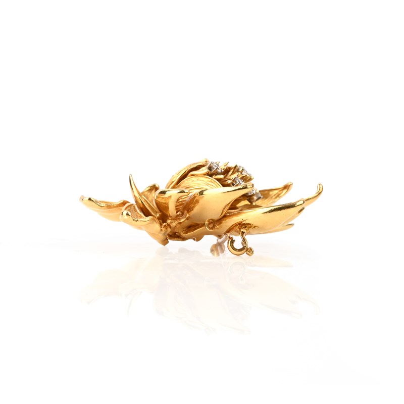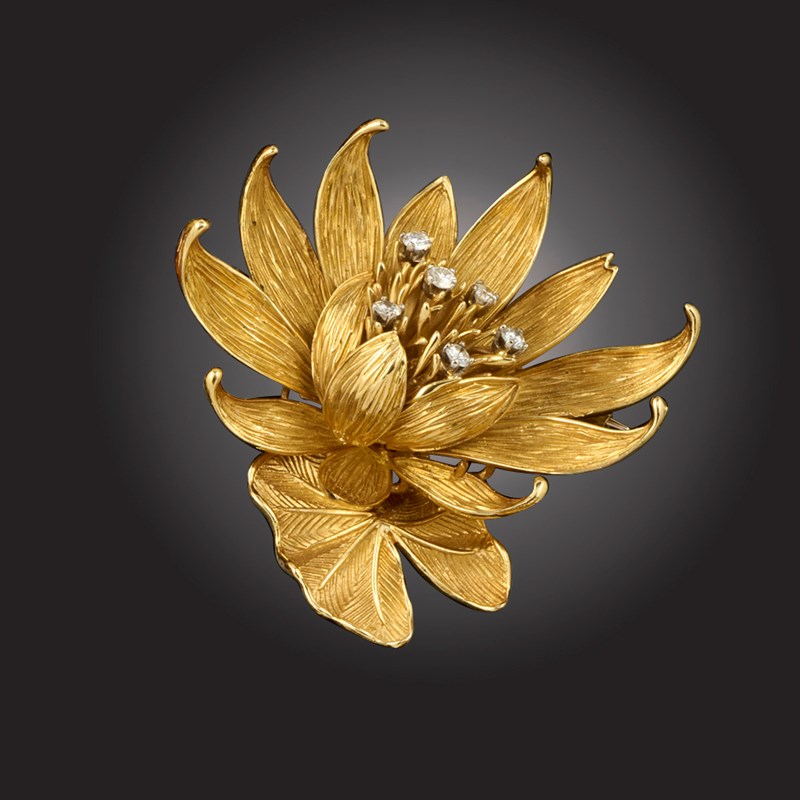 Kutchinsky, an 18ct gold and diamond brooch, circa 1969, designed as a waterlily, the pistils set with round brilliant-cut diamonds, within textured 18ct yellow gold petals, signed Kuchinsky, London hallmarks, date letter for 1969, width 5cm, gross weight 33g