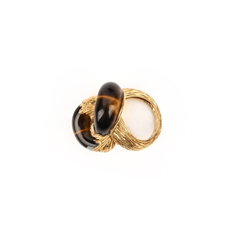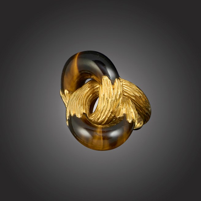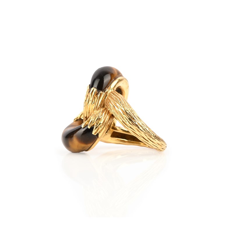 Kutchinsky, a tiger's eye and 18ct gold ring, circa 1971, designed as two interlocking hoops of tiger's eye to a tapering textured 18ct gold shank, signed Kutchinsky, London hallmarks, date letter for 1971, size I 1/2, gross weight 18g