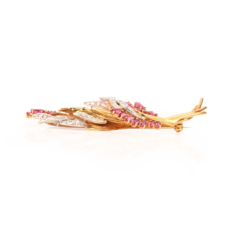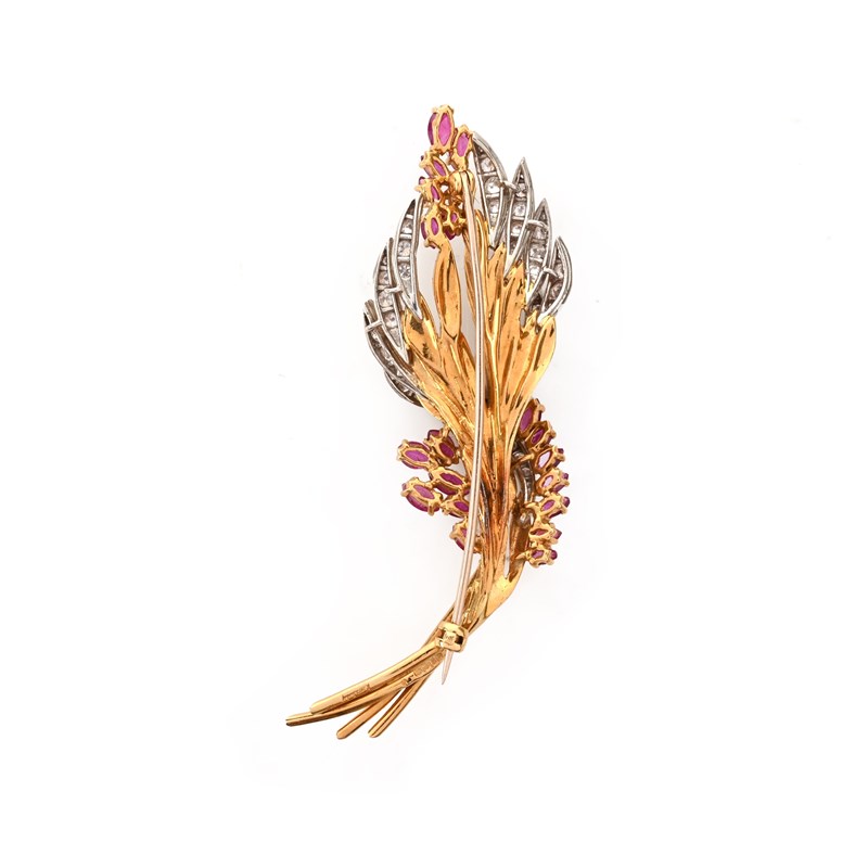 Kutchinsky, a ruby, diamond and 18ct gold brooch, circa 1963, designed as a foliate spray, set with marquise-shaped rubies and graduated round-brilliant cut diamonds, in 18ct yellow gold, signed Kutchinsky, London hallmarks, date letter for 1963, width 8.1cm, gross weight 27g