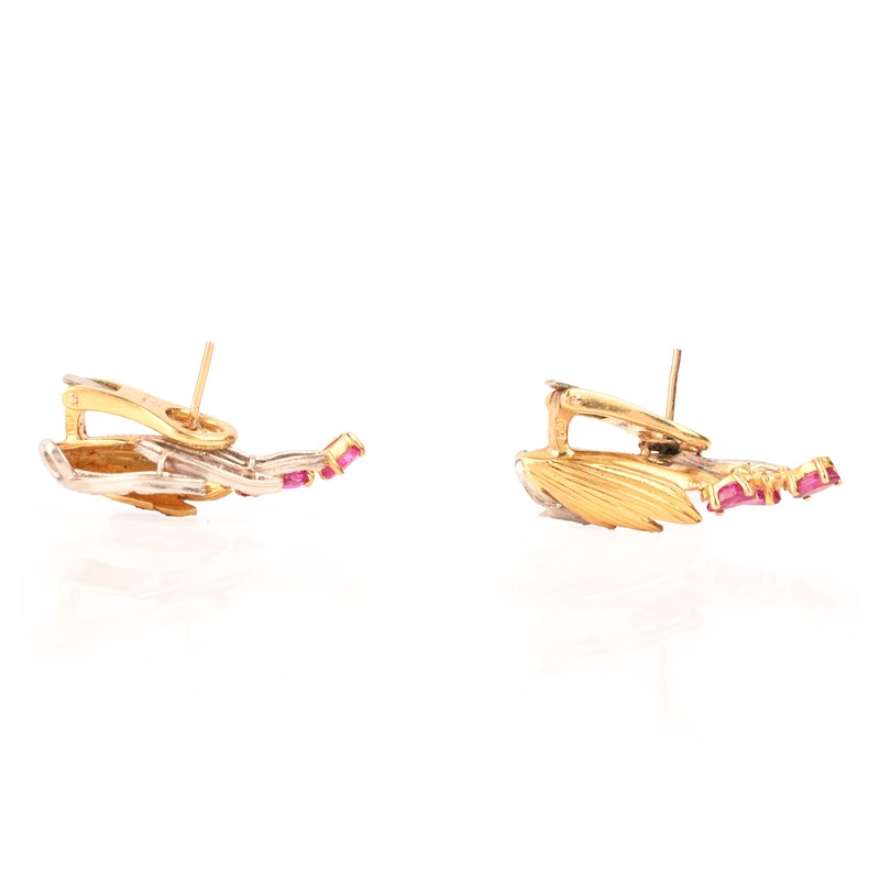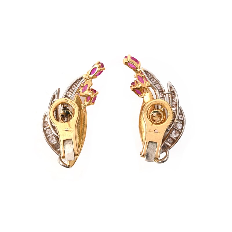 Kutchinsky, a pair of ruby, diamond and 18ct gold earclips, circa 1963, designed as foliate sprays, set with marquise-shaped rubies and graduated round-brilliant cut diamonds, in 18ct yellow gold, signed Kutchinsky, London hallmarks, date letter for 1963, post and clip fittings, width 3.4cm, gross weight 16g