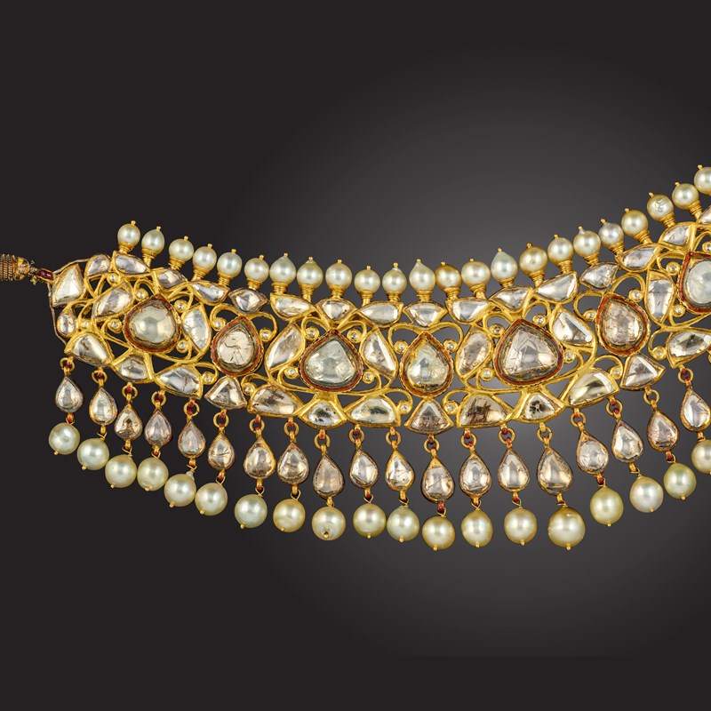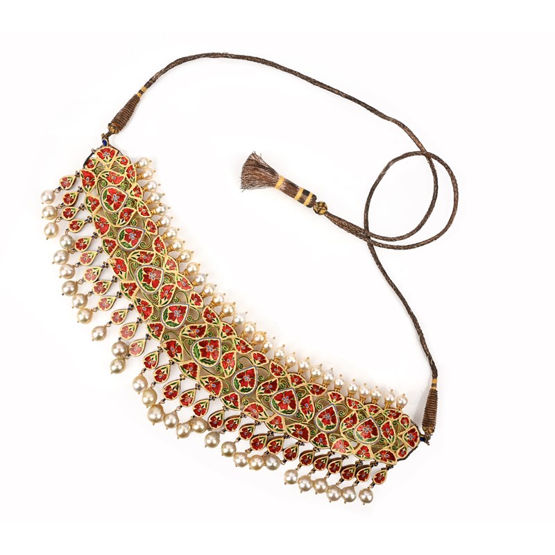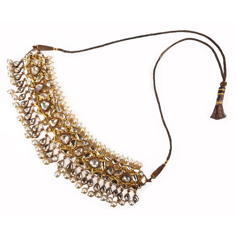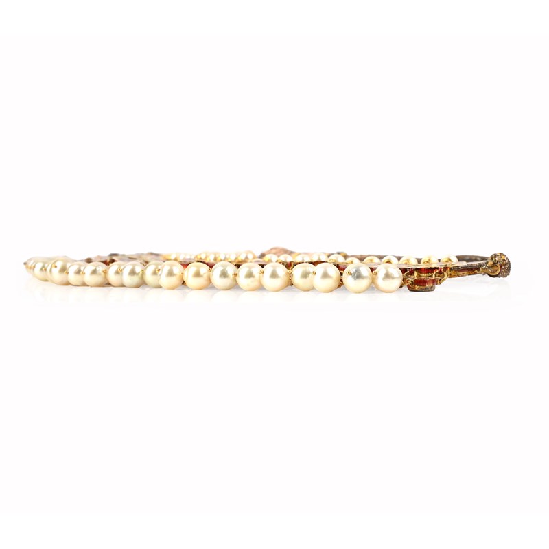 A diamond and cultured pearl necklace, India, of fringe design, composed of a band of lasqué-cut diamonds in elaborate yellow gold mounts below a row of cultured pearl-set terminals and above a fringe of pendants set with lasqué-cut diamonds above cultured pearl drops, the reverse of the necklace with elaborate enamelled green red and blue floral decoration, to a fabric cord, length 66-86cm