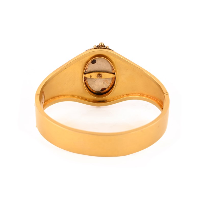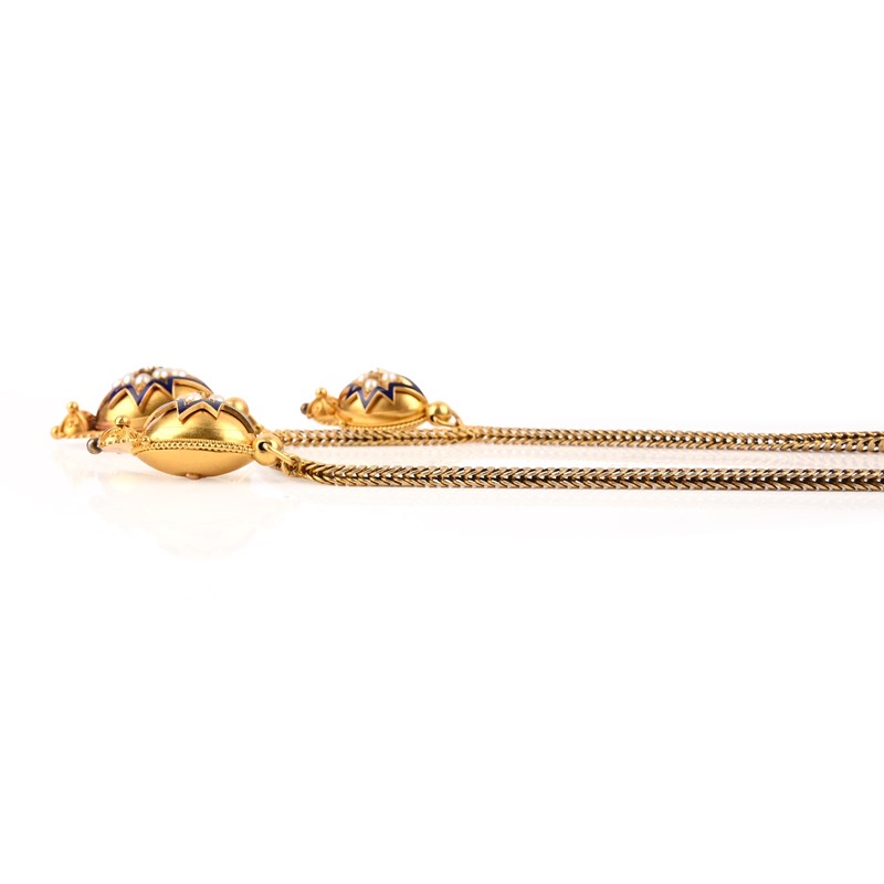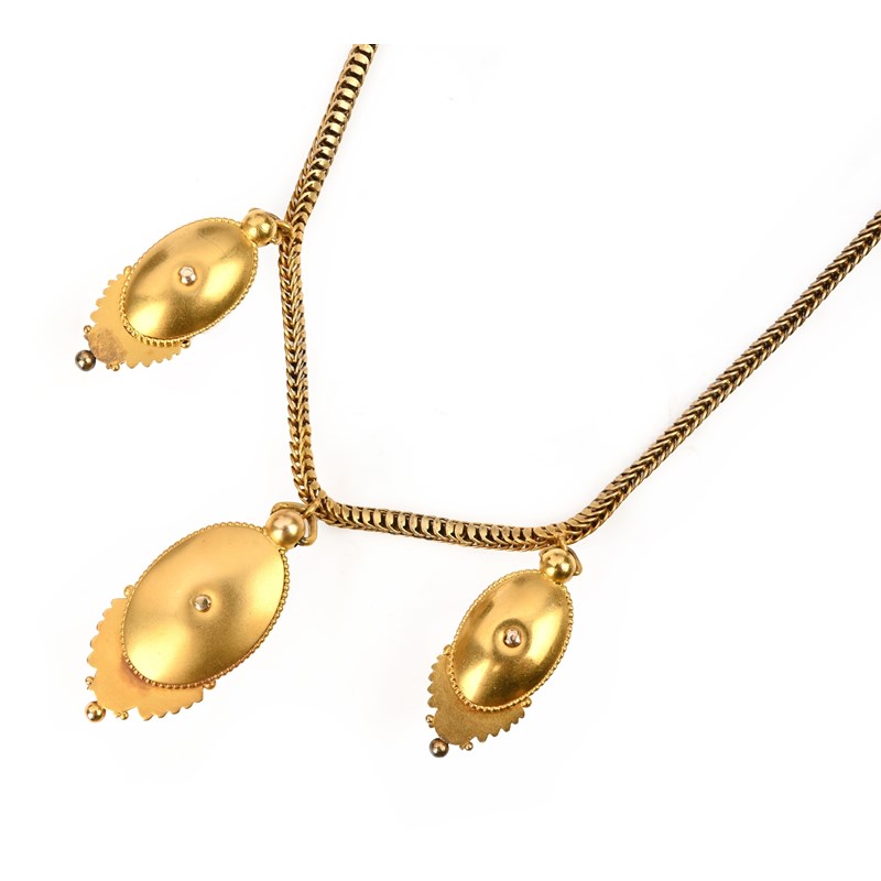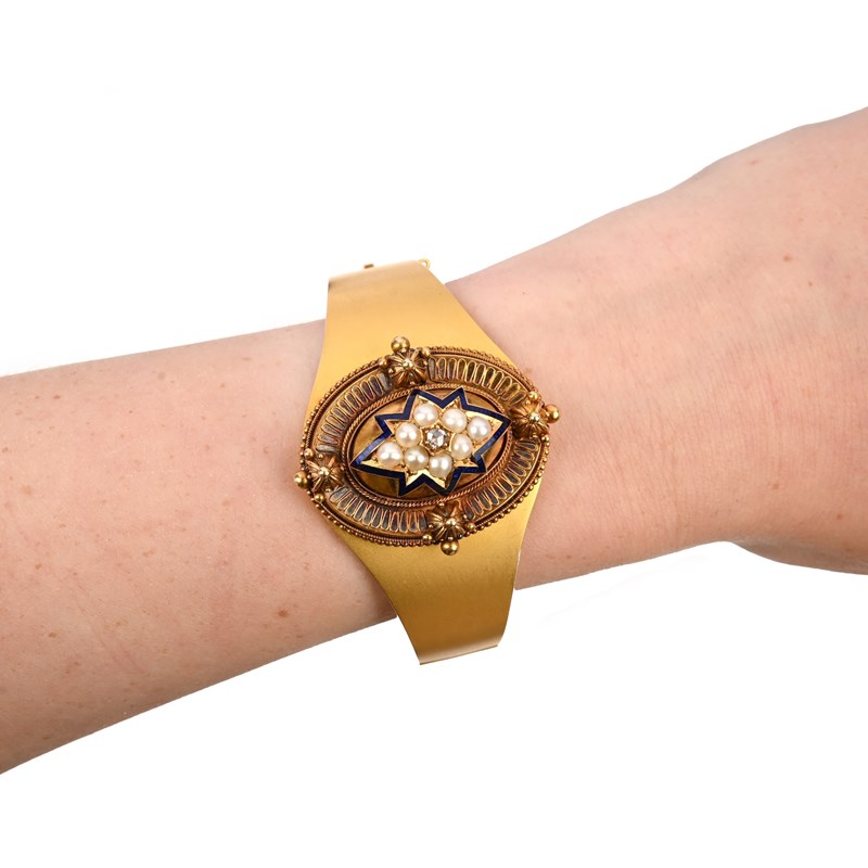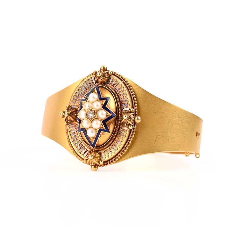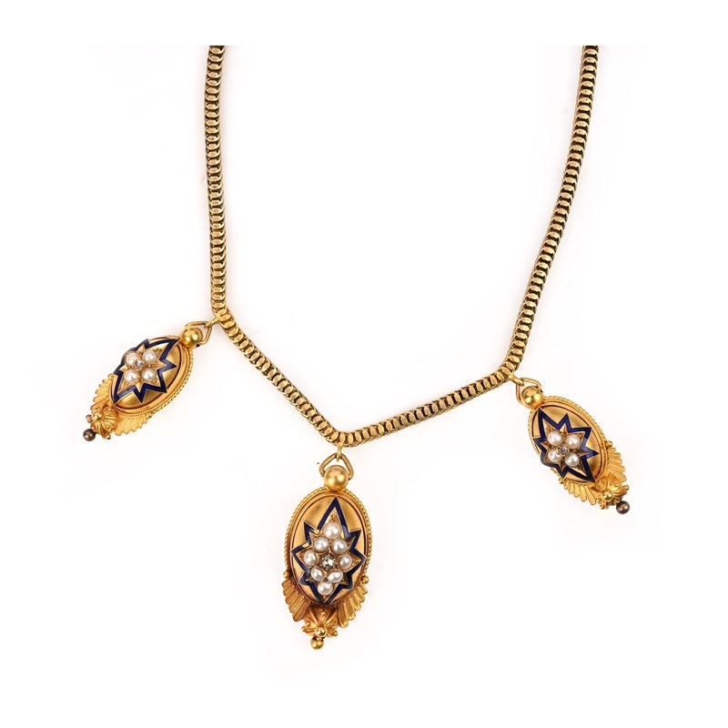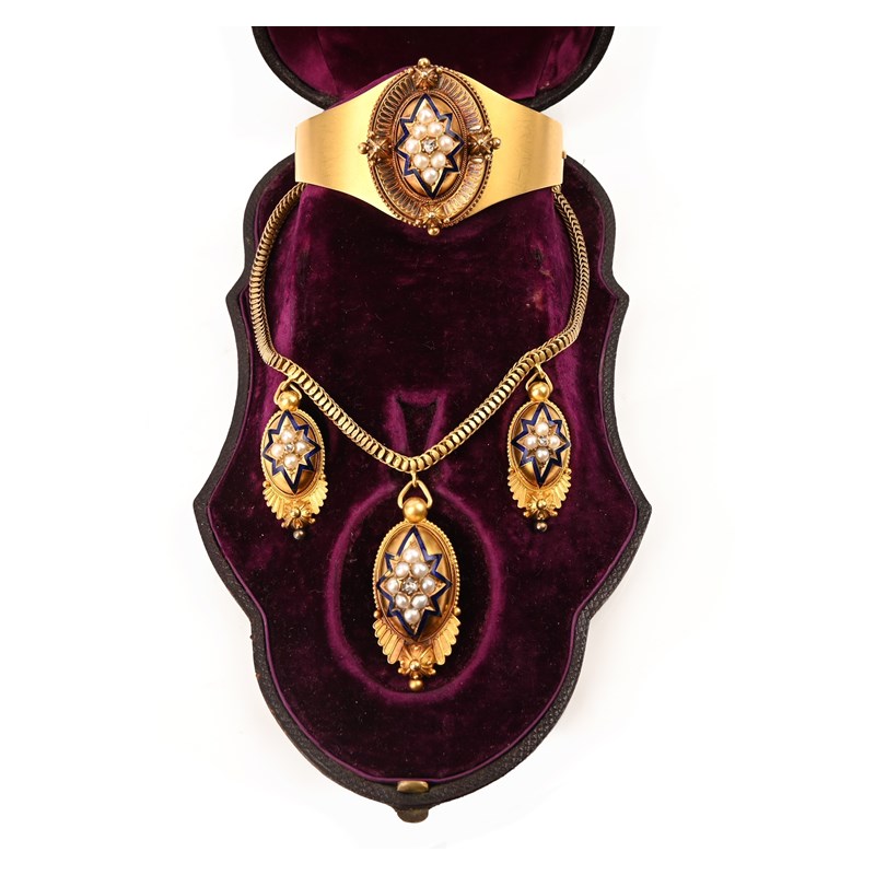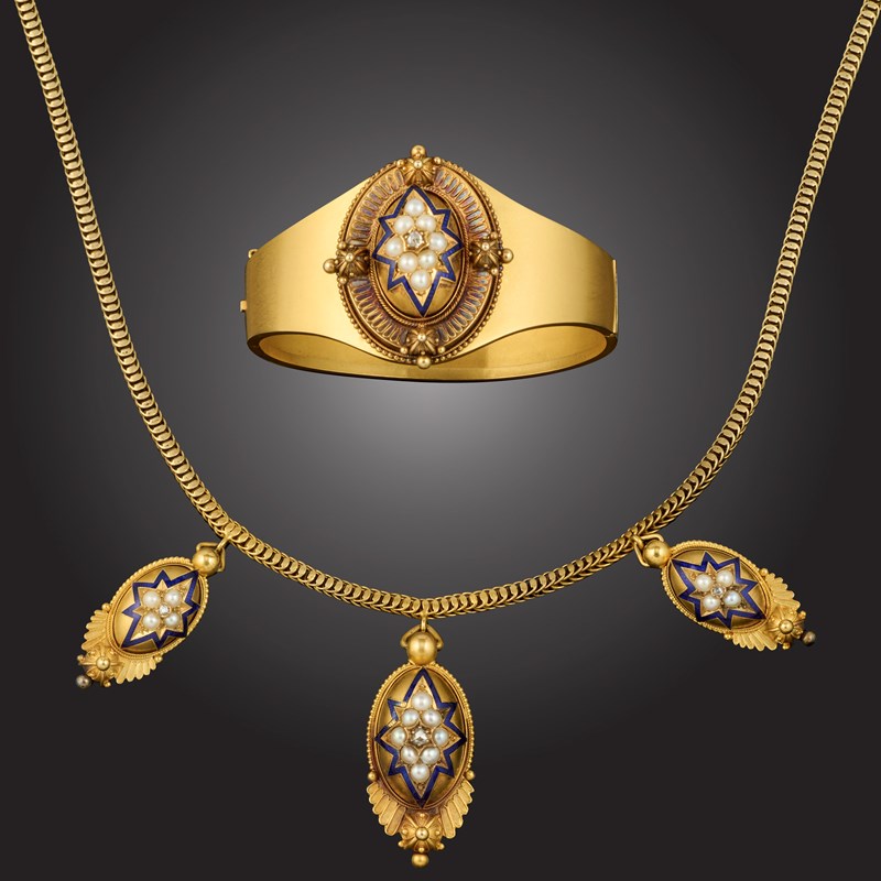 A Victorian demi-parure, mid 19th century, comprising: a seed pearl diamond and enamel bangle, set in starburst motif within twisted rope and pelletwork surround in yellow gold, internal width 6cm; with a matching necklace, the snake-link gold chain suspending three graduated pendants with matching seed pearl diamond and star motifs in yellow gold, length 40cm, case, 71g total