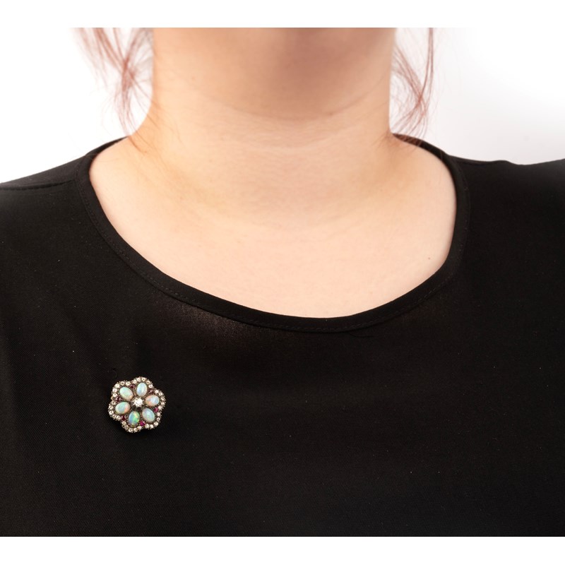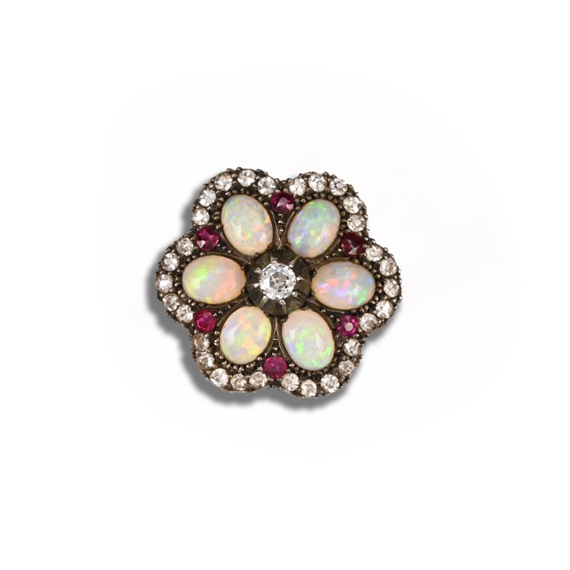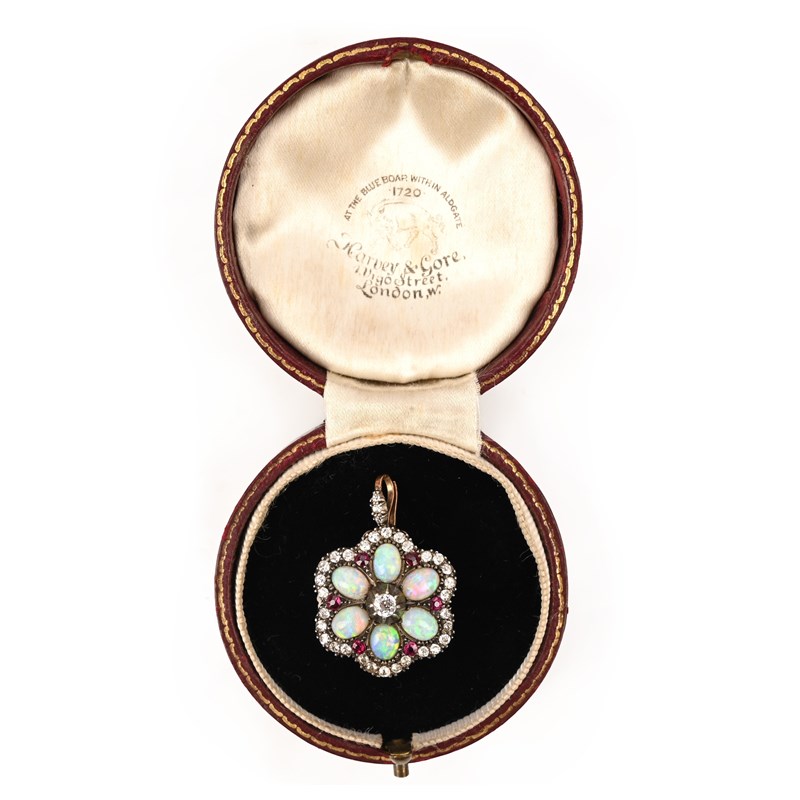 A Victorian opal, diamond and ruby brooch/pendant, late 19th century, in the form of a flowerhead, with an old circular-cut diamond collet-set to the centre, surrounded by five opal cabochons with a border of old circular-cut rubies and diamonds, the folding bail set with three old circular-cut diamonds in gold and silver, with detachable pin, width 2.4cm, Harvey & Gore case