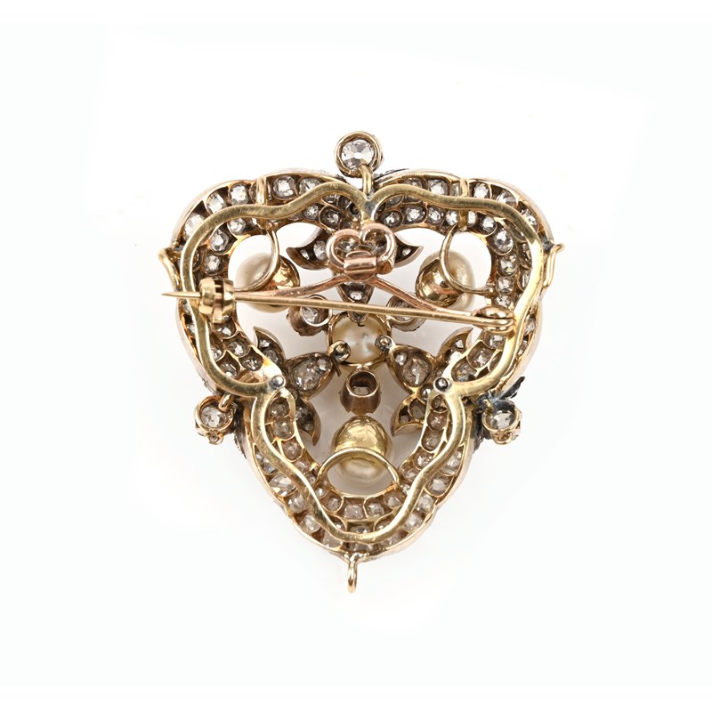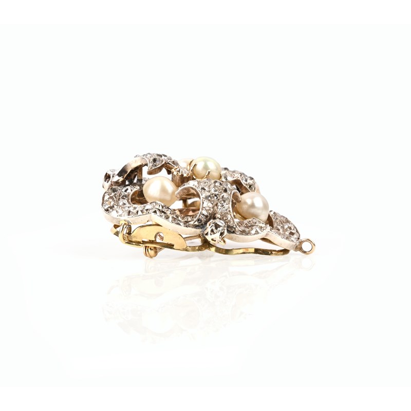 A Victorian natural pearl and diamond brooch, the trefoil brooch set with four pearls within diamond-set fleur-de-lys decoration within outer borders of diamonds in silver and gold, length 4.6cm
