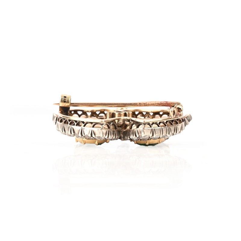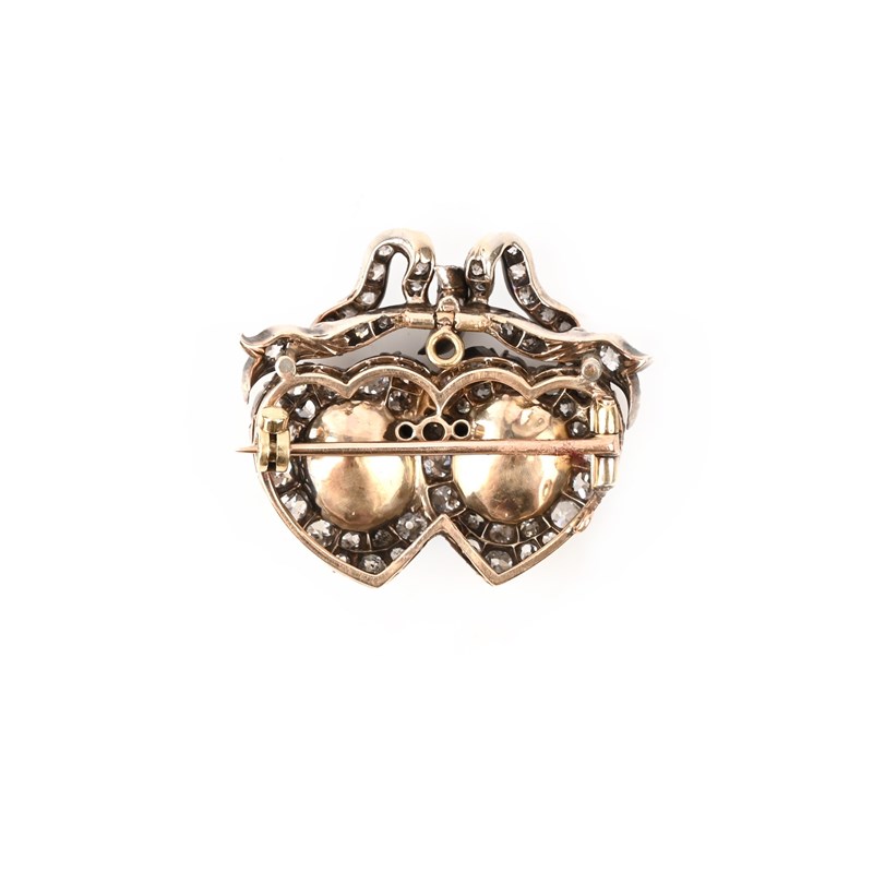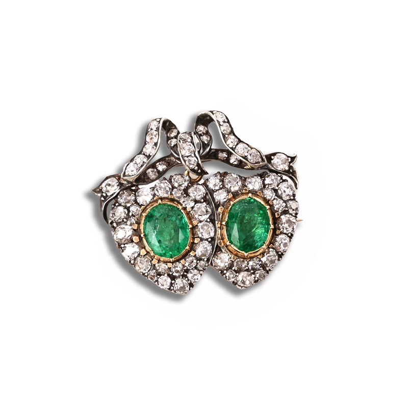 A late 19th century emerald and diamond heart brooch, the diamond-set bow above two interlocking diamond hearts each centring on an oval-shaped emerald in silver and gold, folding pendant loop to reverse, width 3cm, case