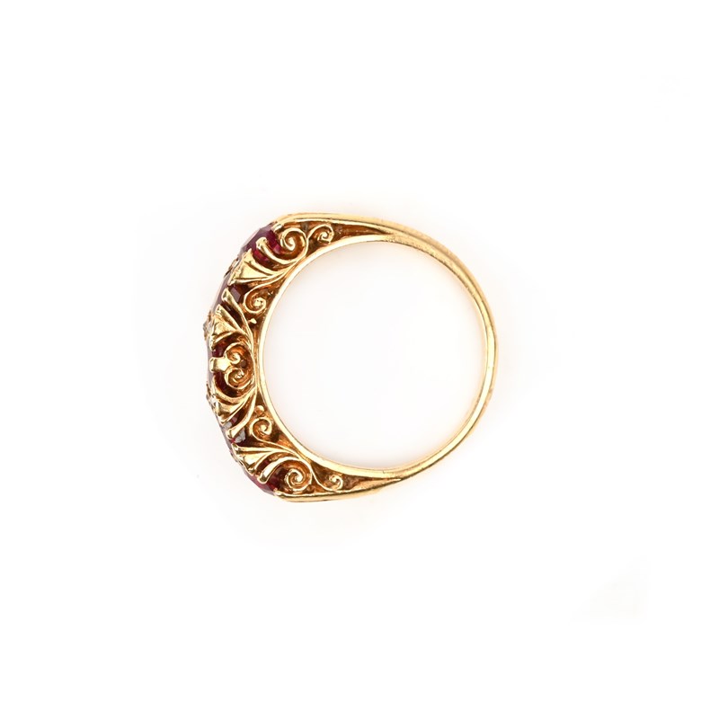A ruby five-stone ring, the graduated cushion-shaped rubies with diamond pointers in carved and pierced yellow gold setting, French import mark, size N 1/2