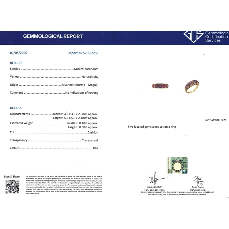 Accompanied by report number 5785-2269 from GCS which states that the natural cushion-cut rubies show no indications of heat treatment, origin: Burma, Mogok