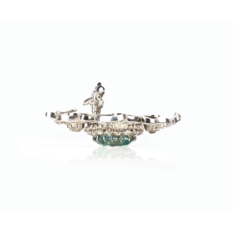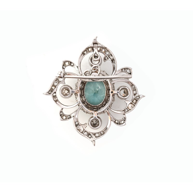 A late 19th century zircon and diamond brooch pendant, the cushion-shaped blue zircon within quatrefoil diamond-set surround in silver and gold, later rhodium plating, folding pendant loop and detachable brooch fittings, length 4.5cm