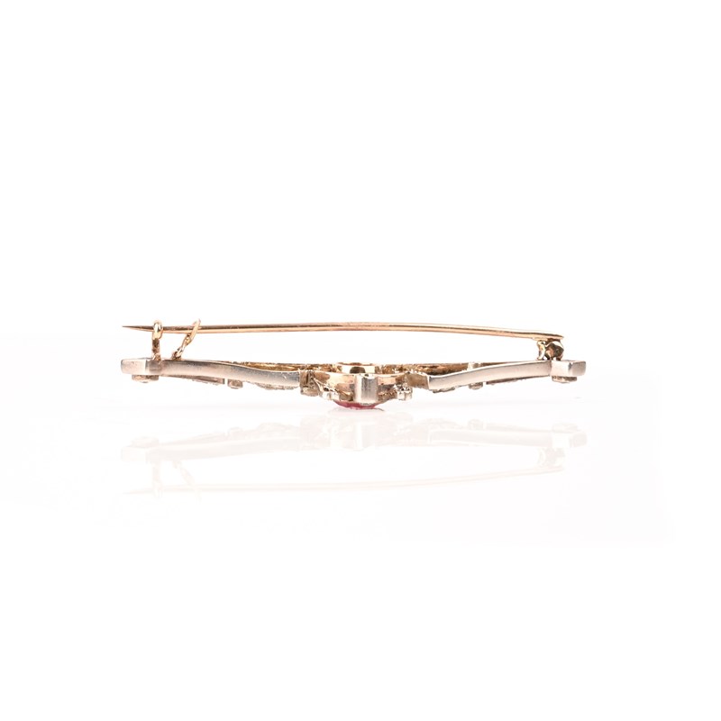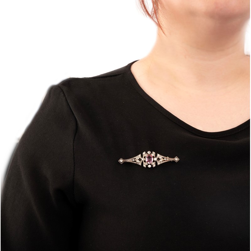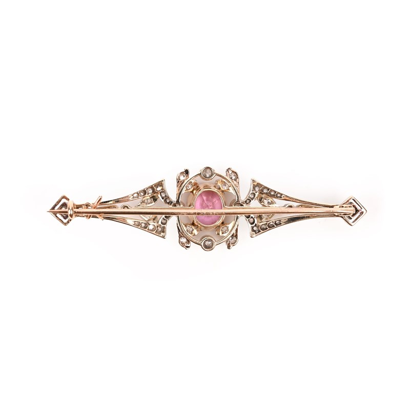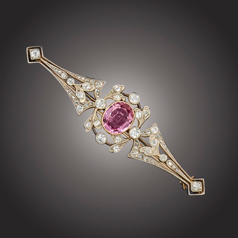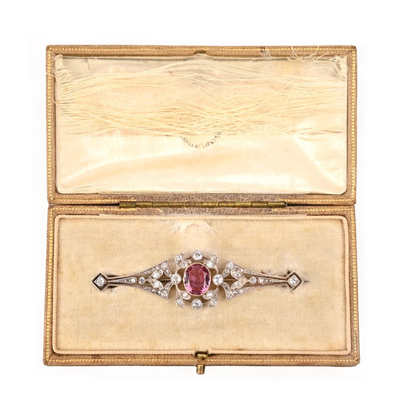 An Edwardian pink tourmaline and diamond brooch, centring on an oval pink tourmaline within tapered foliate scroll surrounds of diamonds in silver and gold, length 6.6cm, case