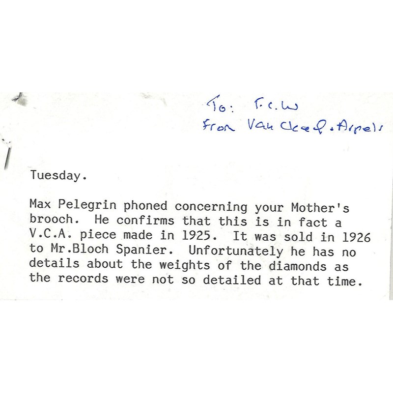 Accompanied by a facsimile copy of the original drawing of the brooch with the corresponding number and a note referencing a conversation with Van Cleef & Arpels confirming the brooch was made in 1925 and sold in 1926