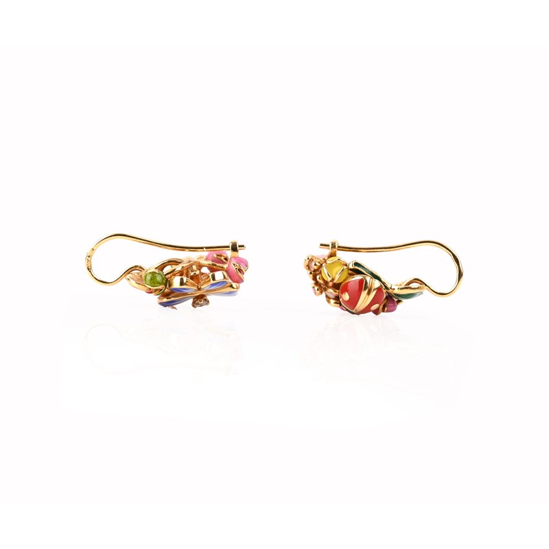 Dior, a pair of diamond and enamel 'Diorette' earrings, designed as clusters of flowers and insects, each earring accented with a round brilliant cut diamond, in gold, signed Dior, numbered K8219-AU750, French control marks, length 2.3cm, gross weight 10g