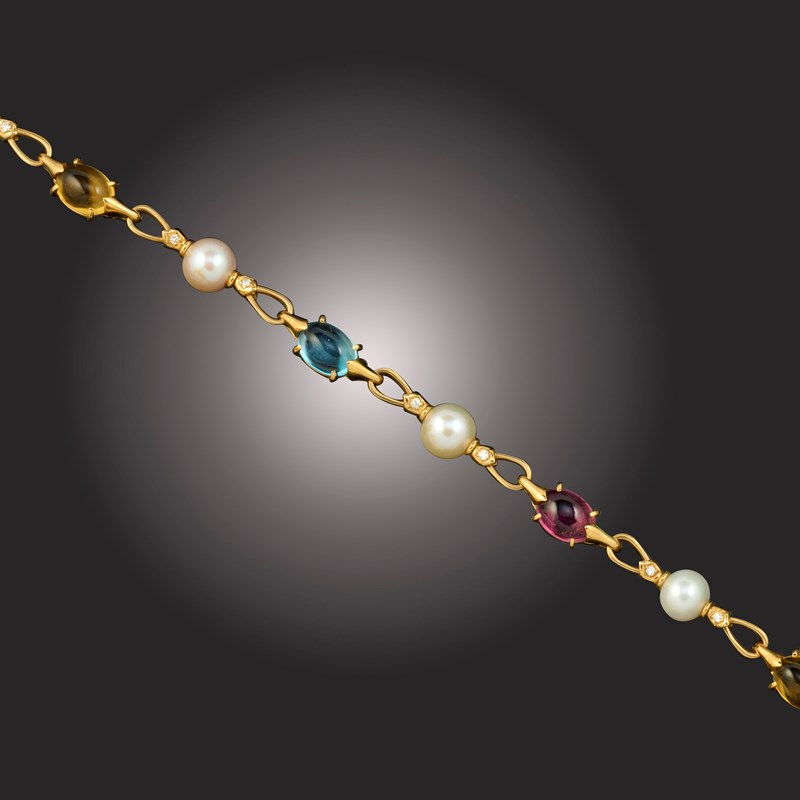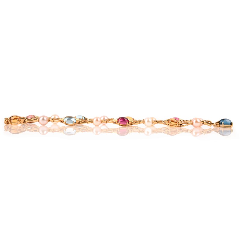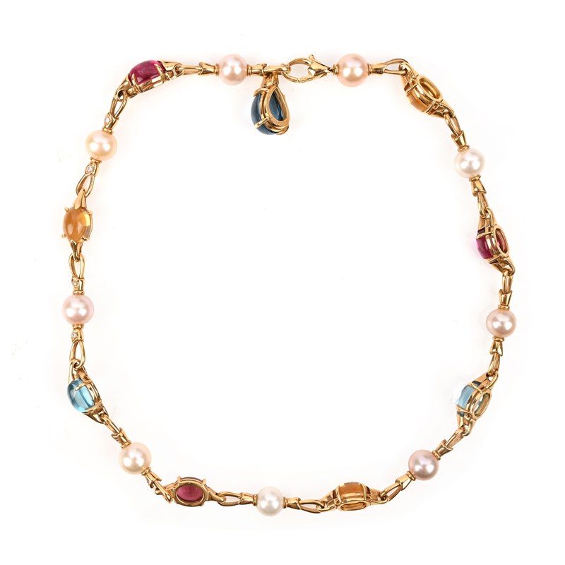 Bulgari, an 'Allegra' multi-gem necklace, the 18ct gold link chain set with citrine, pink tourmaline and blue topaz cabochons, alternating with cultured pearls and round brilliant-cut diamonds, stamped BULGARI, 750, Made in Italy, length 45cm