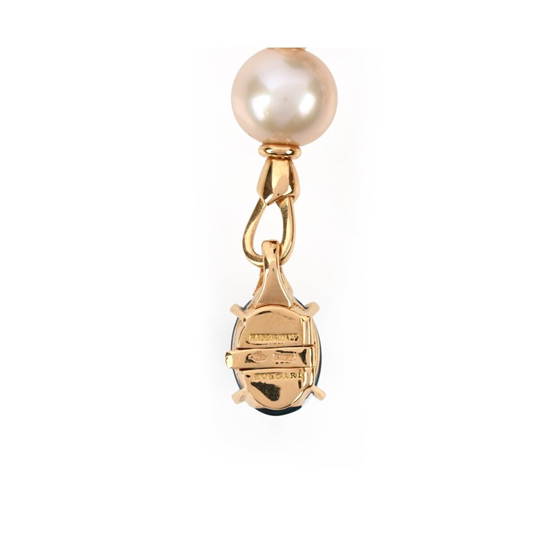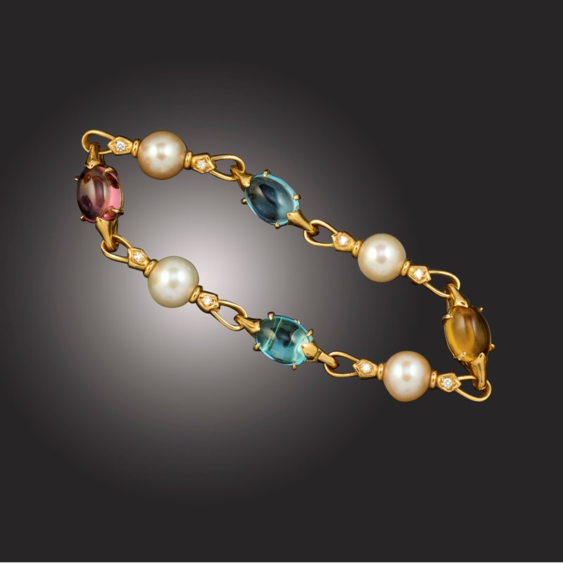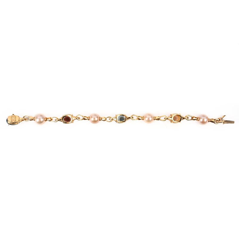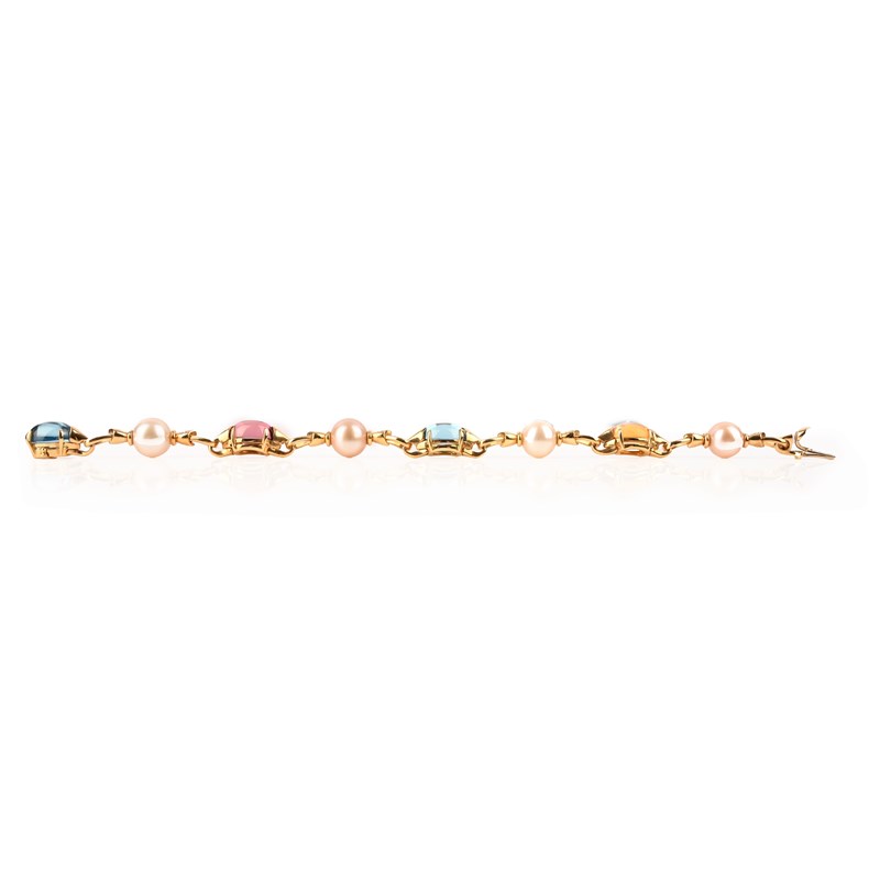 Bulgari, an 'Allegra' multi-gem bracelet, the 18ct gold link chain set with citrine, pink tourmaline and blue topaz cabochons, alternating with cultured pearls and round brilliant-cut diamonds, stamped BULGARI, 750, Made in Italy, length approximately 19.5cm