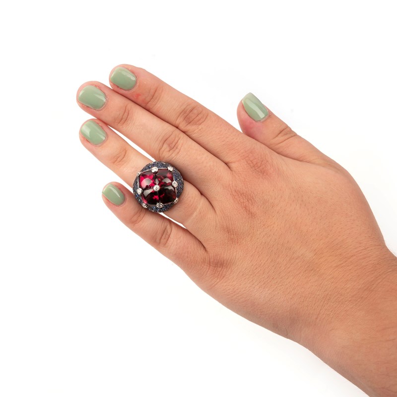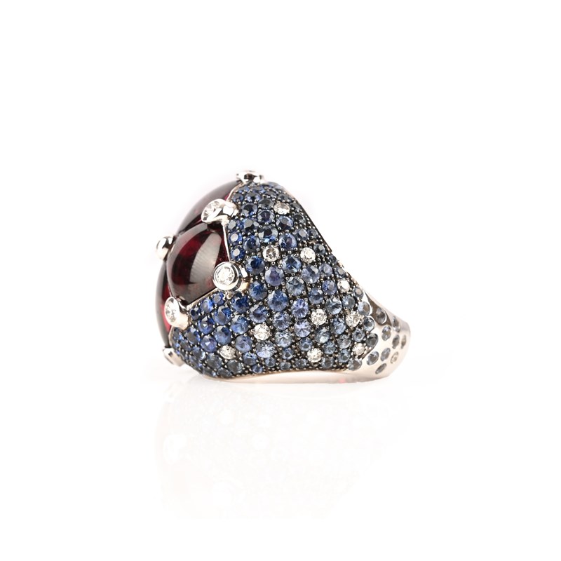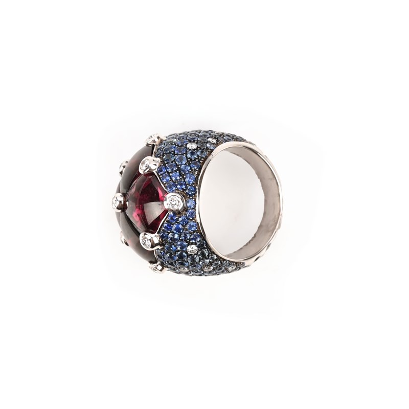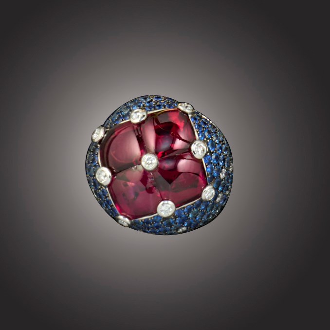 Avakian, a 'Rainbow' ring, set with four buff-top tourmalines between collet-set round brilliant-cut diamonds, in a bombé mount pavé-set with round brilliant-cut sapphires graduating from darker blue to white and diamonds, in 18ct white gold, stamped 750 and maker's mark, size M