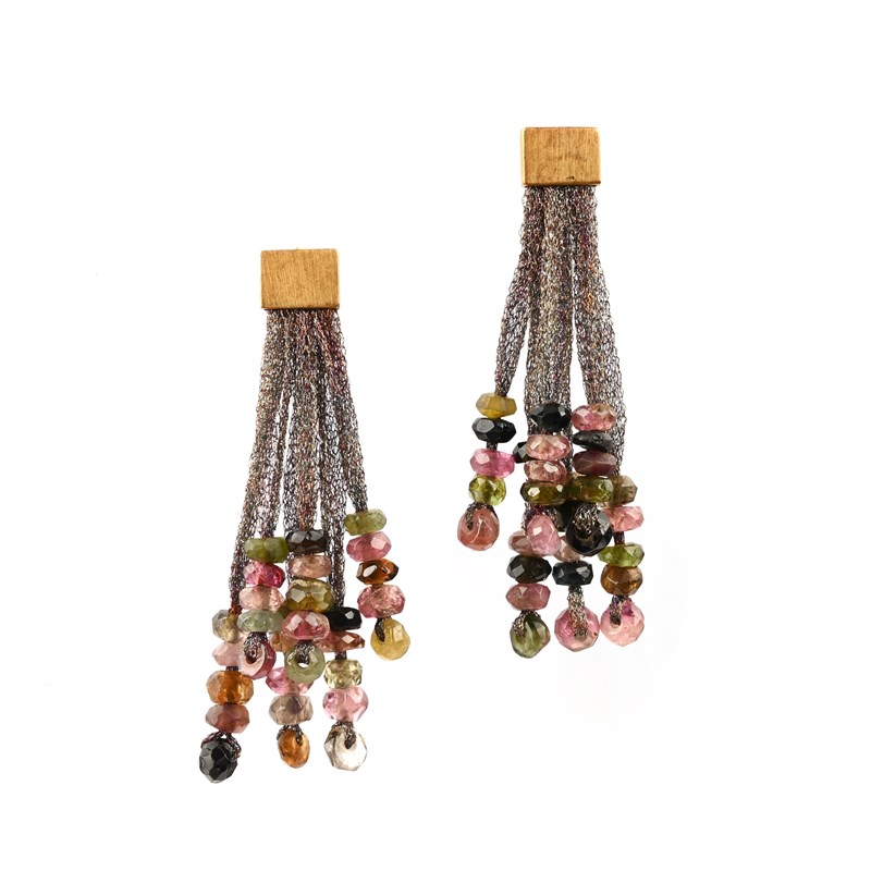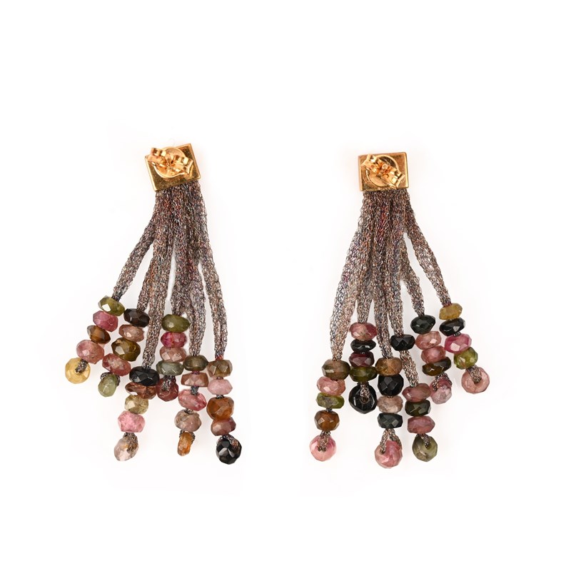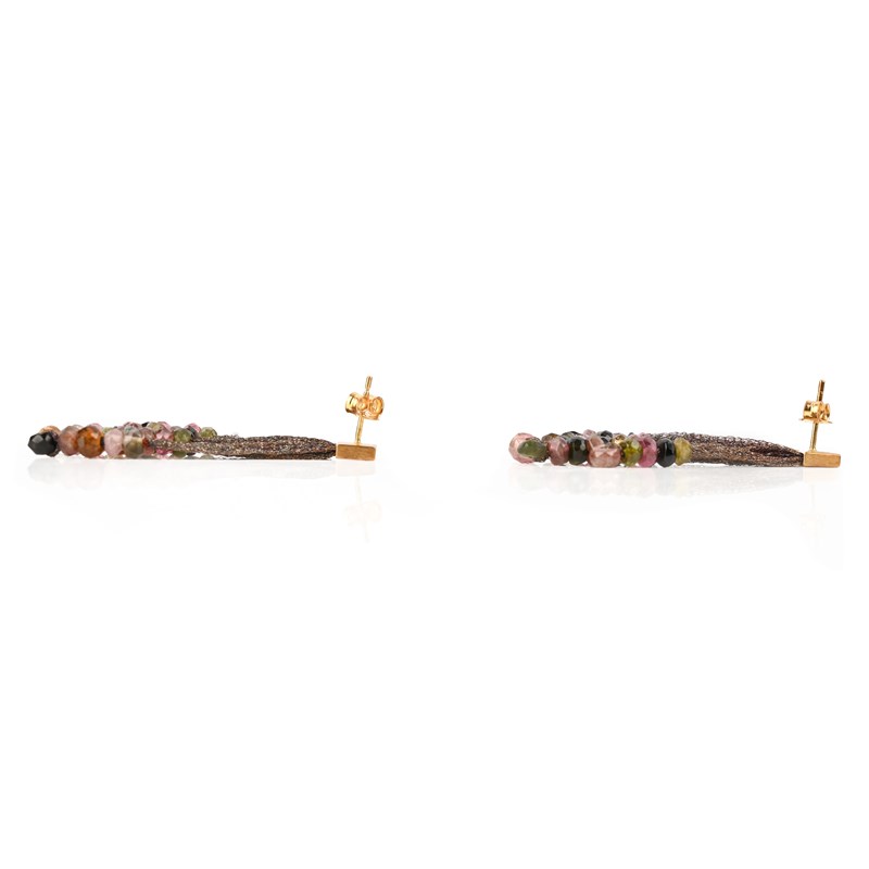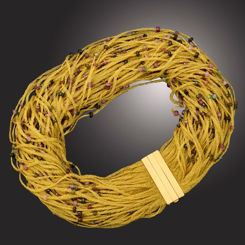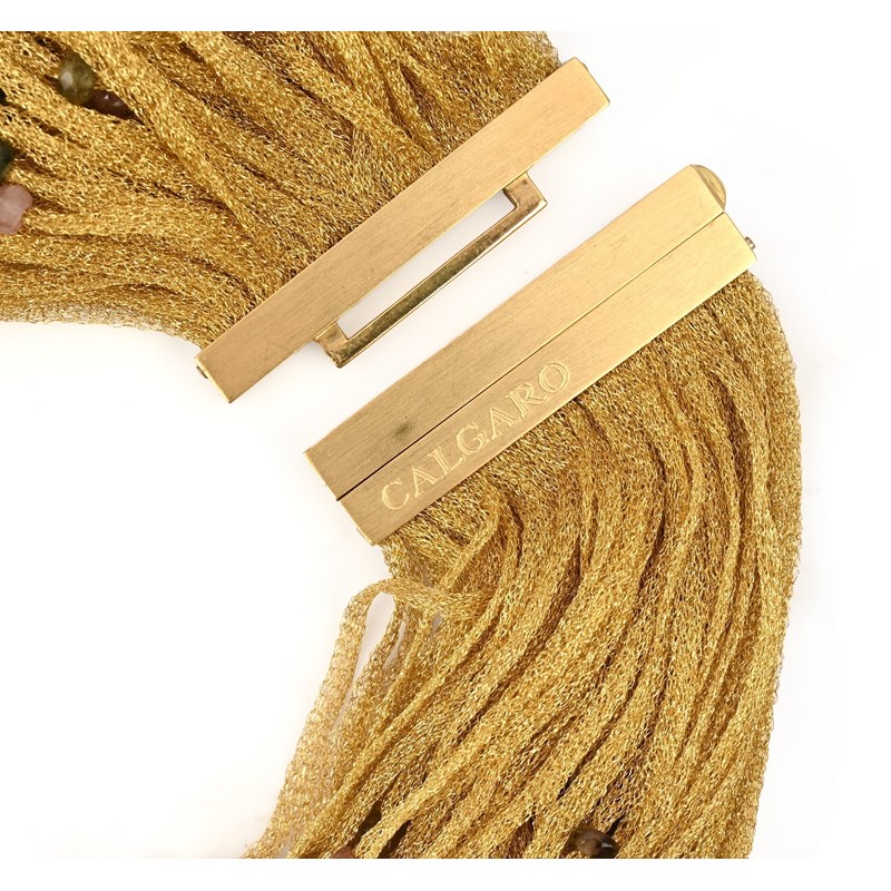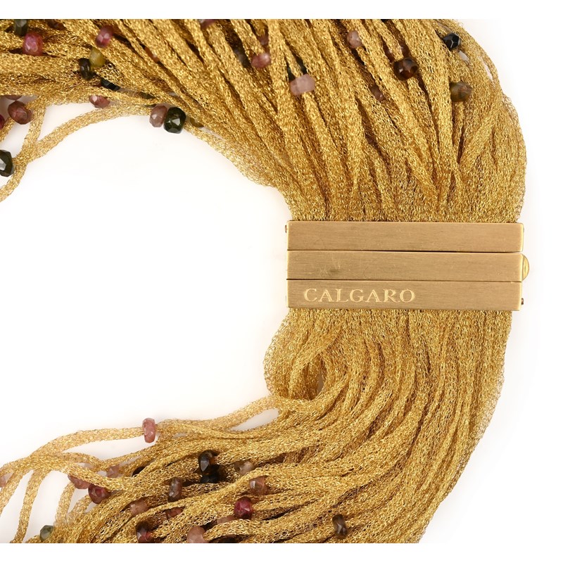 Calgaro, a gold and tourmaline 'Rugiada' collar necklace and similar pair of earrings, the necklace composed of yellow gold mesh strands strung with faceted tourmaline beads, signed Calgaro, stamped 750, length 42.5cm, gross weight 100g, box stamped Calgaro; and a pair of earrings composed of six two-colour graduated gold mesh strands strung with faceted tourmaline beads, stamped 750, post fittings, length 5cm, gross weight 7g