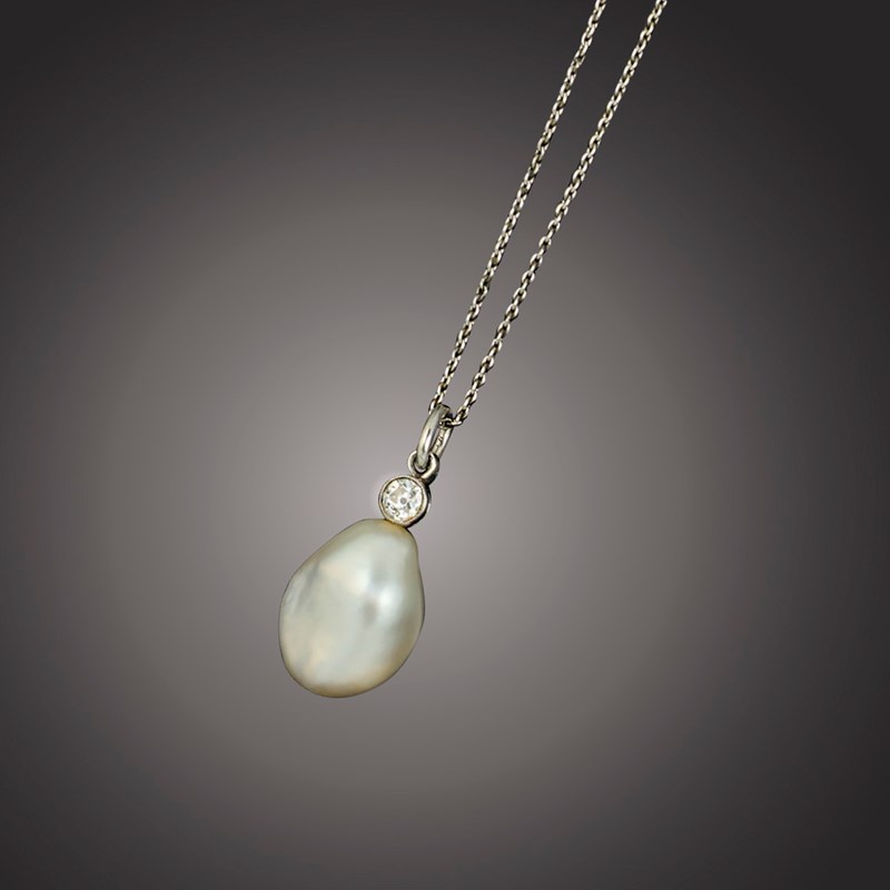A natural pearl and diamond pendant, the old circular-cut diamond rubover-set in platinum and suspending a drop-shaped pearl measuring 16.05 x 12.11 x 8.84mm, on fine-link platinum neck chain, chain length 48cm, case