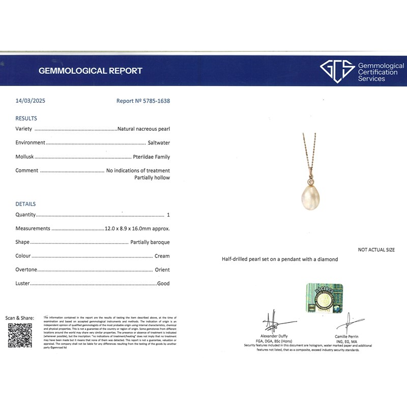 Accompanied by report number 5785-1638 from GCS stating that the partially hollow pearl is natural saltwater