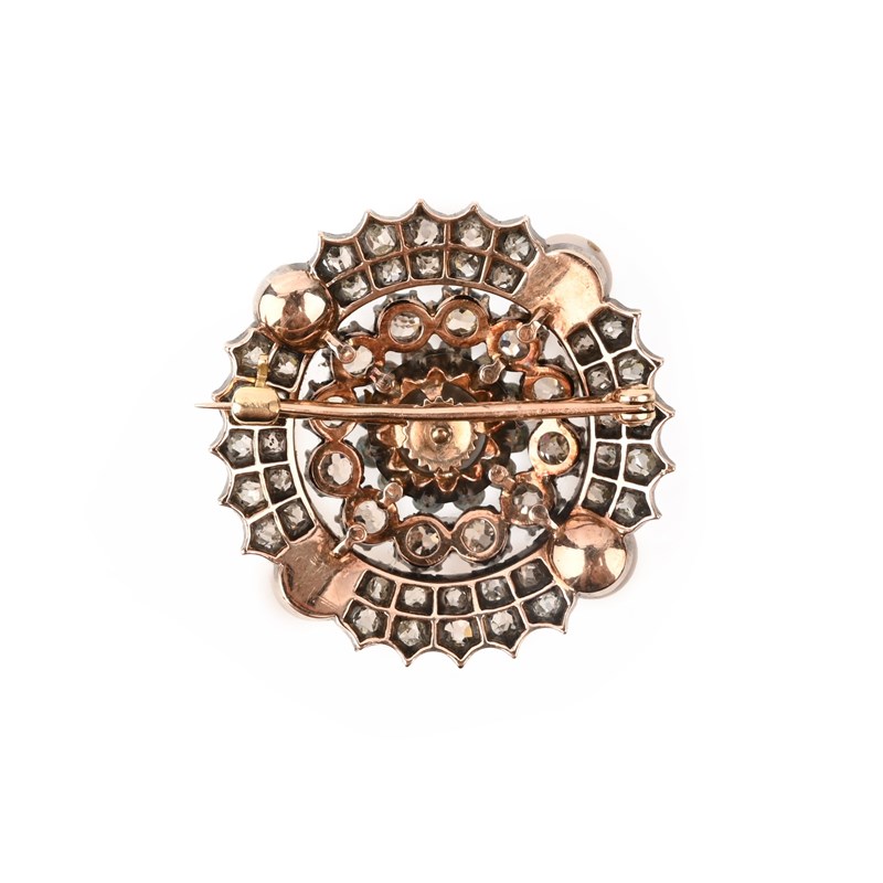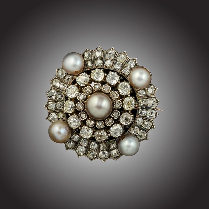 A natural pearl and diamond target brooch, late 19th century, centring on a button-shaped grey pearl within radiating surrounds of old cushion-shaped diamonds and four further pearls in silver and gold, width 3.1cm