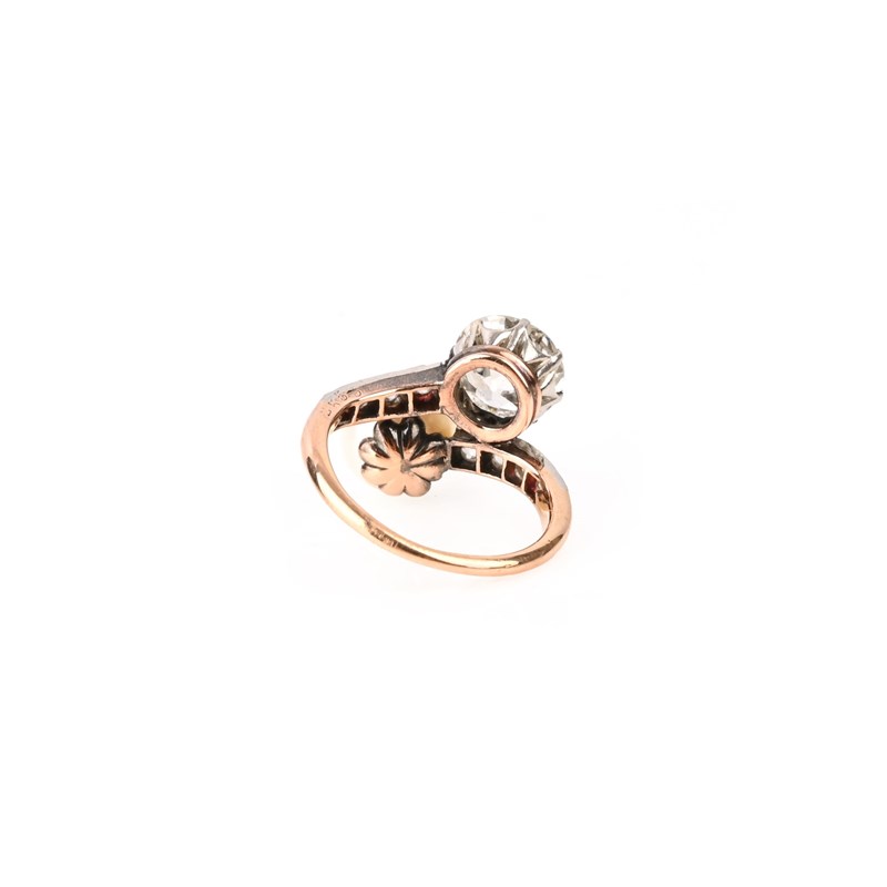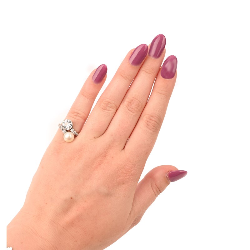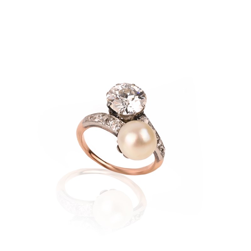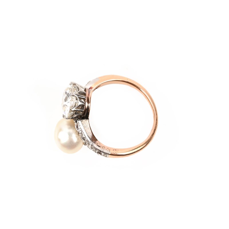 A natural pearl and diamond crossover ring, early 20th century, of 'Toi et Moi' design set with a button-shaped pearl and old circular-cut diamond within diamond-set shoulders in platinum and gold, numbered 2553, diamond approximately 1.75cts, pearl untested, size I 1/2