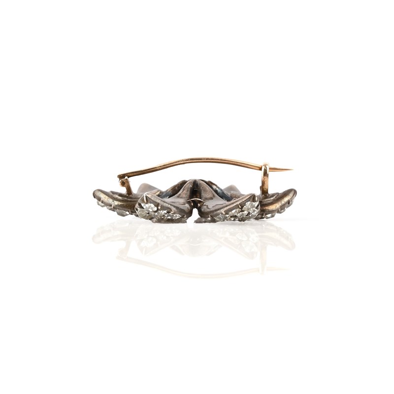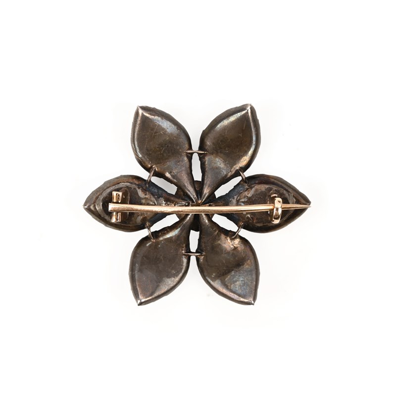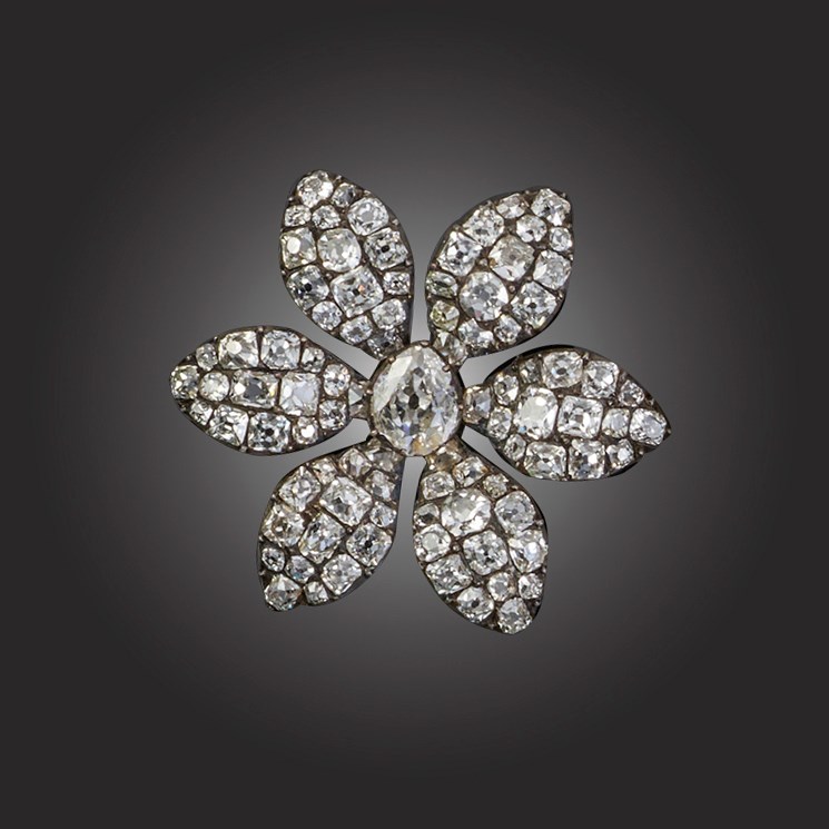 A George III diamond-set flower brooch, circa 1790, the central pear-shape diamond surrounded by six petals, each pavé set with old-mine-cut diamonds, in a silver closed-back setting, with later gold pin, width 3.8cm