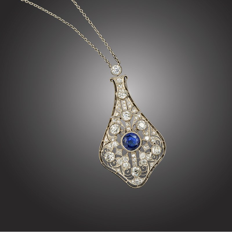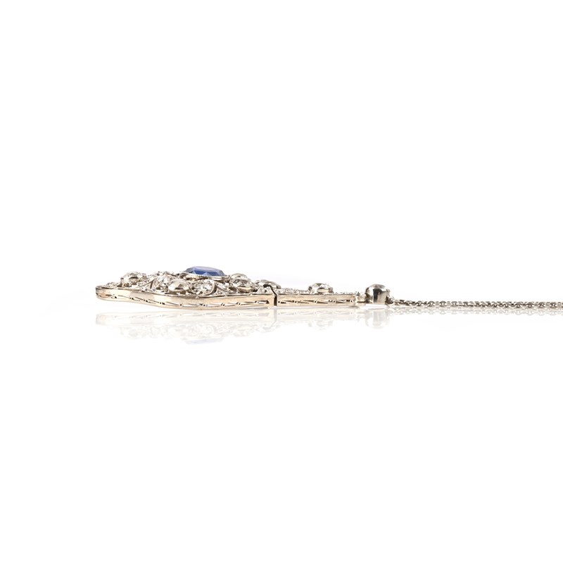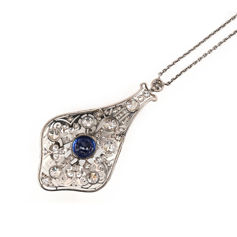 A Belle Epoque sapphire and diamond pendant necklace, of pierced foliate design millegrain-set with graduated old circular-cut diamonds centring on a circular-cut sapphire in platinum and gold, on a fine-link silver neck chain, pendant length 6cm, chain length 48cm