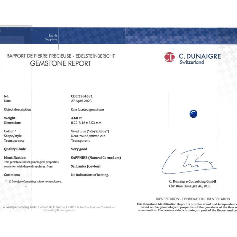 Accompanied by report number CDC2304531 dated 27th April 2023 from C. Dunaigre stating that the natural sapphire weighing 4.68cts with Royal Blue colour, shows no indications of heating, origin Sri Lanka (Ceylon)