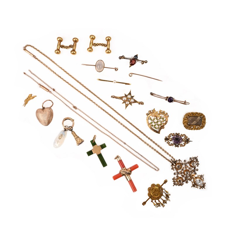 A collection of jewellery, comprising: Child & Child, a demantoid garnet and seed pearl brooch, of heart shaped design, in yellow gold, maker's mark for Child & Child, width 2.5cm, gross weight 6g, enamel stripped, fitted case stamped Child & Child; a cruciform gold pendant set with white paste, to a fine link gold chain, pendant length 5.3cm, chain length 45cm; a heart-shaped locket pendant, to a fine link gold chain, pendant length 3cm, chain length 38, weight 4g, chain broken; two cruciform pendants, one set with coral, the other with nephrite, lengths 5cm and 3.8cm; a gold clasp suspending an initialled gem-set fob seal and a glass shoe-shaped pendant, length 4cm; nine gold brooches, including one centring on a glazed hairwork panel, one set with an amethyst, and one set with diamonds and half-pearls, together with a hare-shaped gold pendant, max. length 6cm, overall gross weight 26g, one pin detached; and a pair of gold cufflinks, terminal width 1.7cm, weight 6g