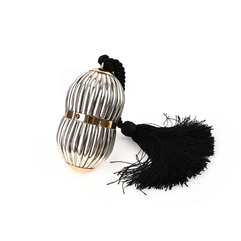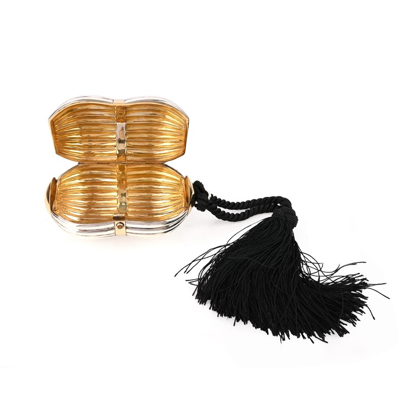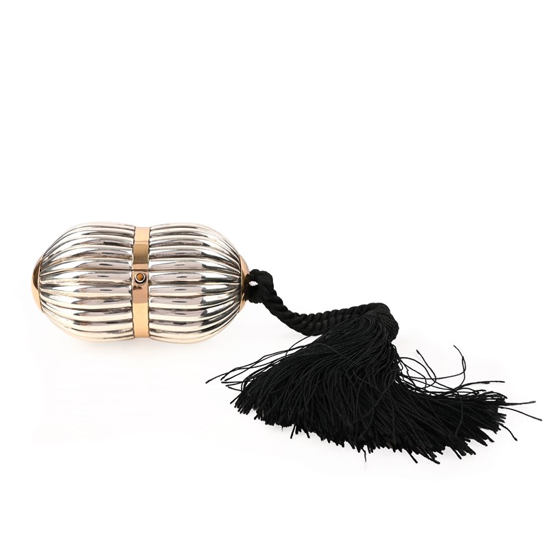 Gucci, a silver evening clutch purse, of reeded and waisted form, with a tiger's eye clasp, stamped GUCCI, 750 and 18k, length 14cm, with a black tassel rope handle