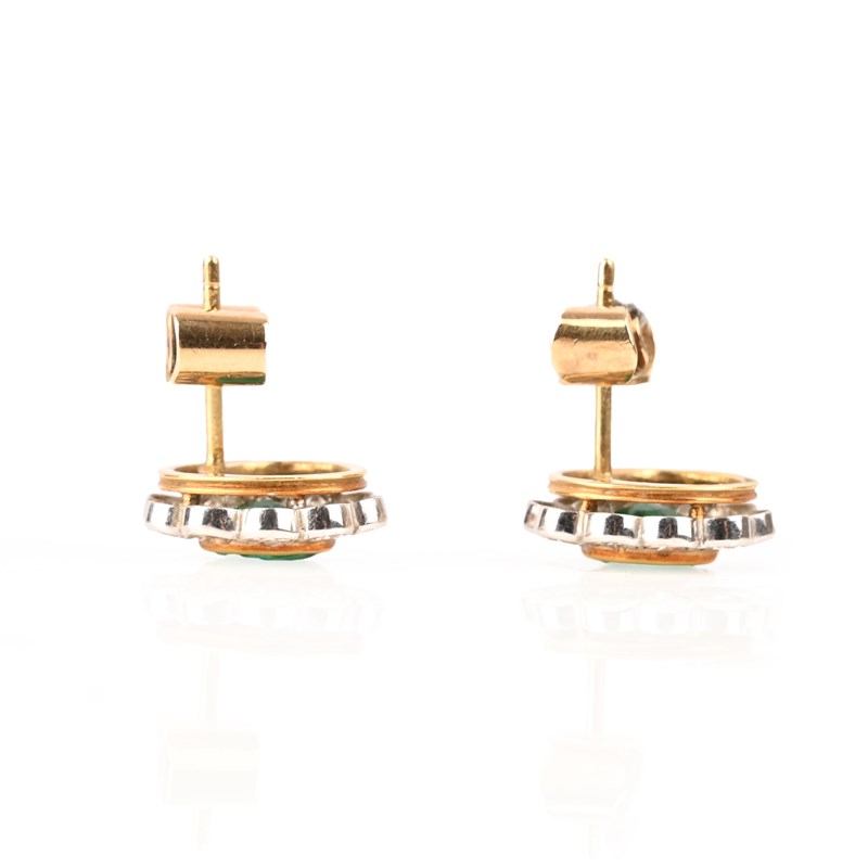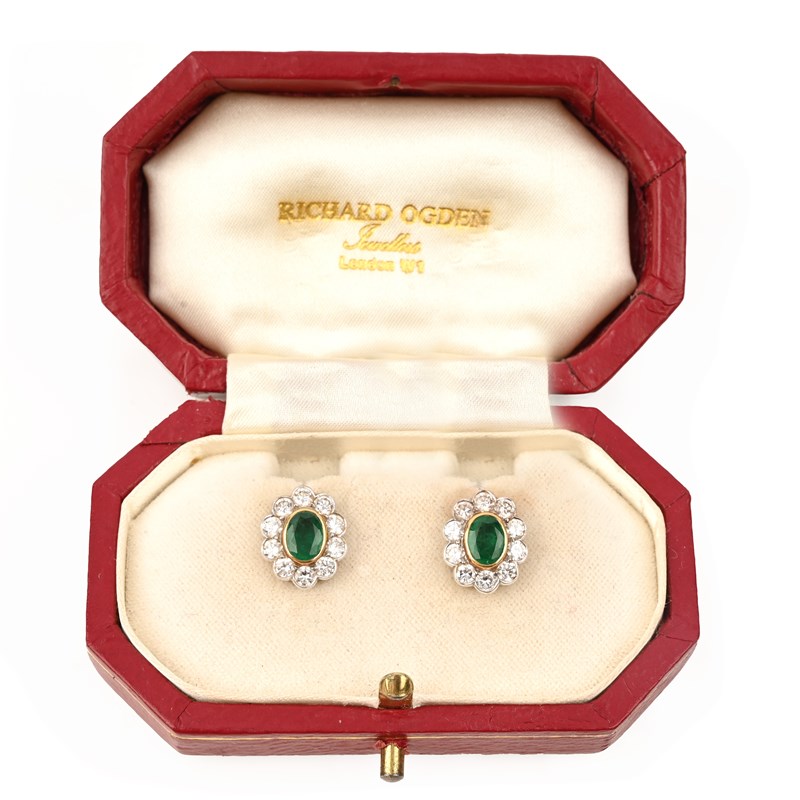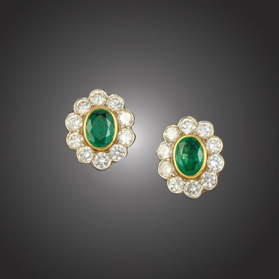A pair of emerald and diamond cluster earrings, the oval-shaped emeralds within a surround of ten round brilliant-cut diamonds in yellow gold, post fittings, length 12mm, case