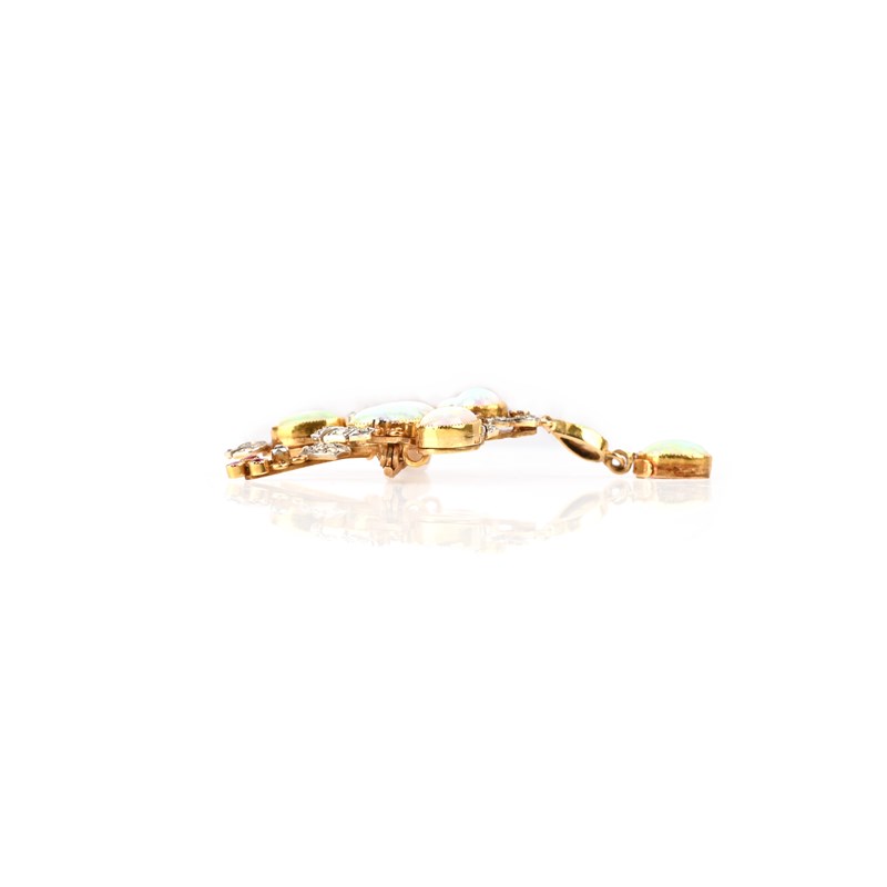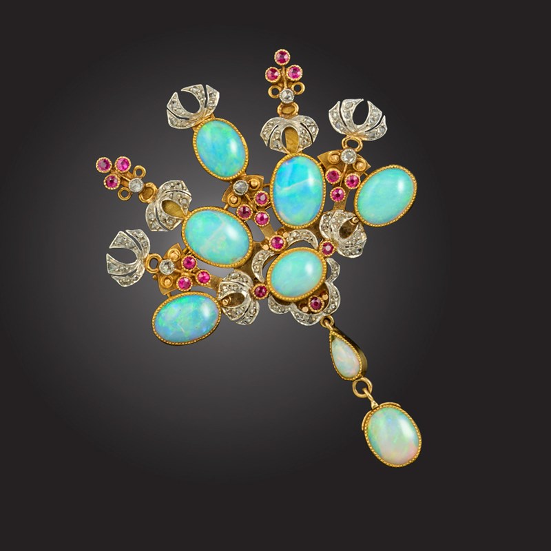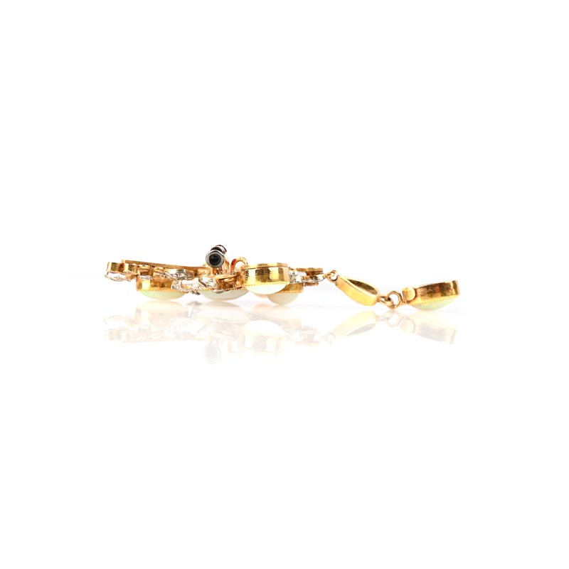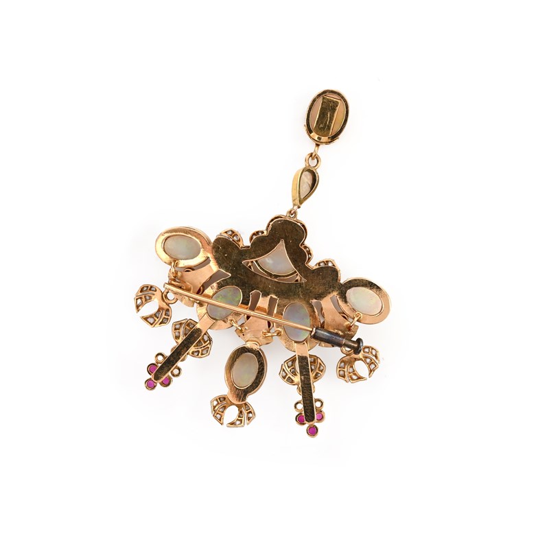 An opal and diamond spray brooch, converted, set with cabochon white opals within ruby and diamond accents and suspending a further opal drop in yellow gold, length 7cm