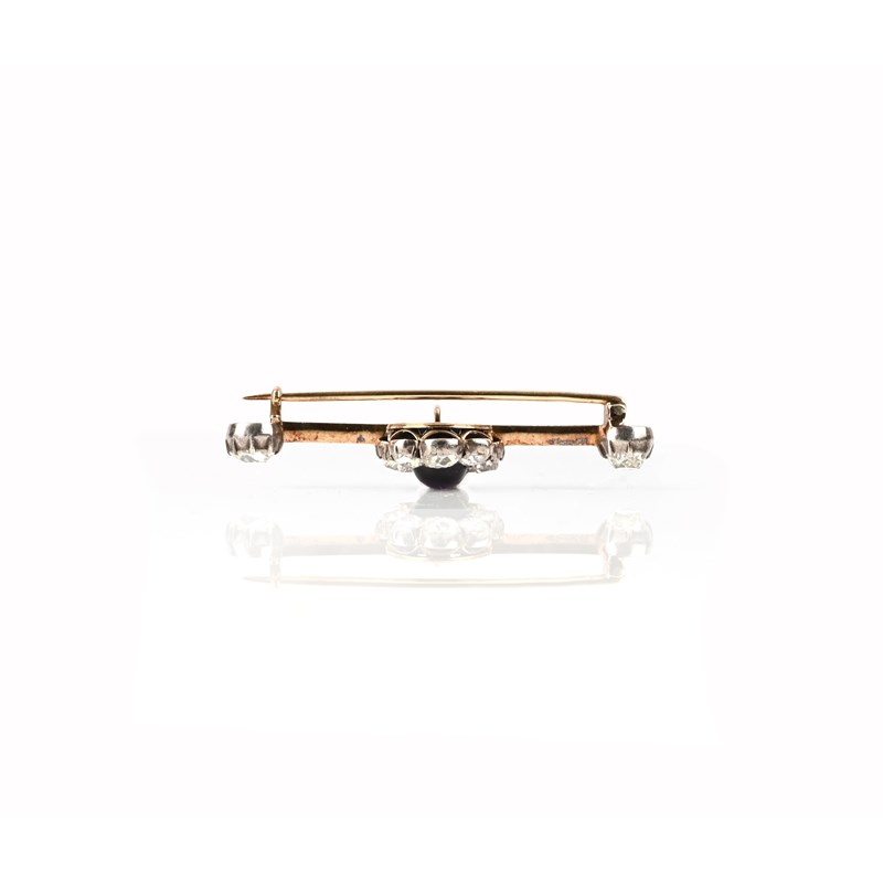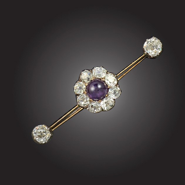 A late 19th century amethyst and diamond brooch, set with a central amethyst cabochon within diamond surround on plain bar brooch with old circular-cut diamond terminals in yellow gold, length 4.5cm