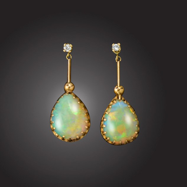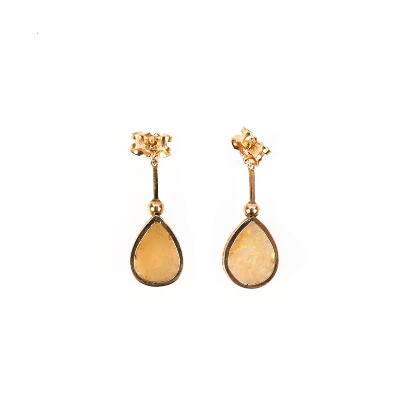 A pair of opal and diamond drop earrings, the pear-shaped opal cabochons suspended from knife-edge links and a small diamond in gold, length 2.7cm
