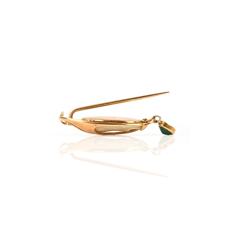 Murrle Bennett, a gold and mother-of-pearl brooch pendant, the mother of pearl within stylised gold surround suspending a turquoise drop in yellow gold, maker's mark to reverse, stamped 15ct, no clasp fitting, length 4.2cm