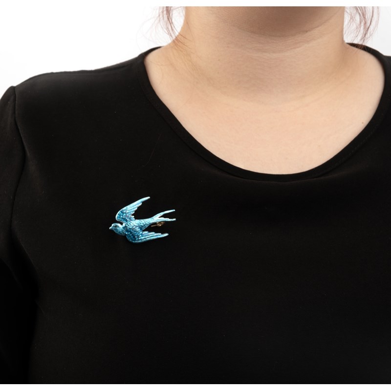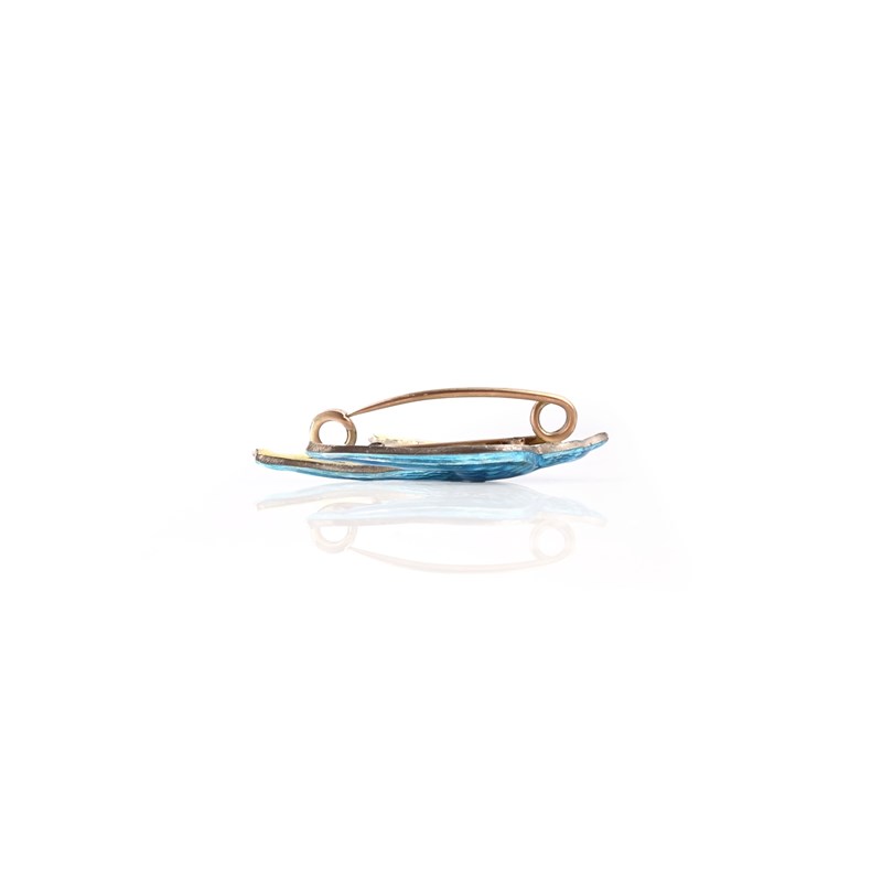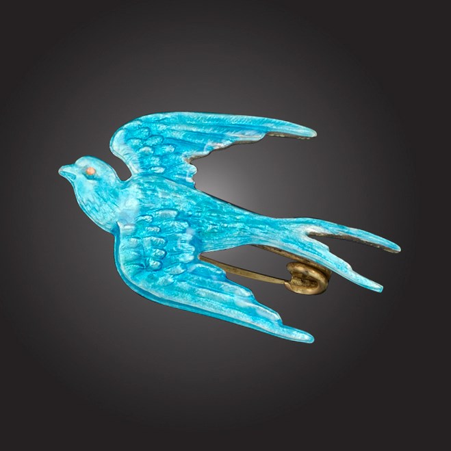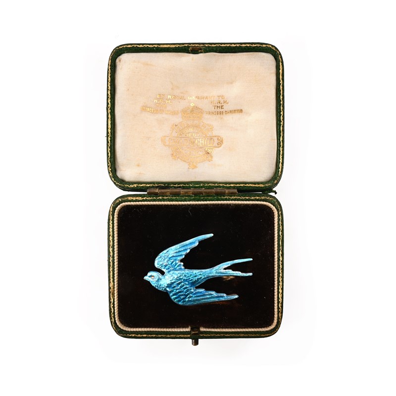 Child & Child, a silver and enamel brooch, circa 1905, designed as a swallow applied with translucent blue basse-taille enamel detailed with an orange eye, length 4.2cm, maker's mark for Child & Child to pin, fitted case stamped Child & Child