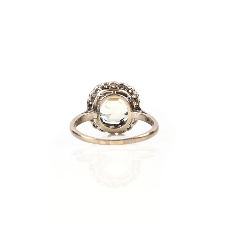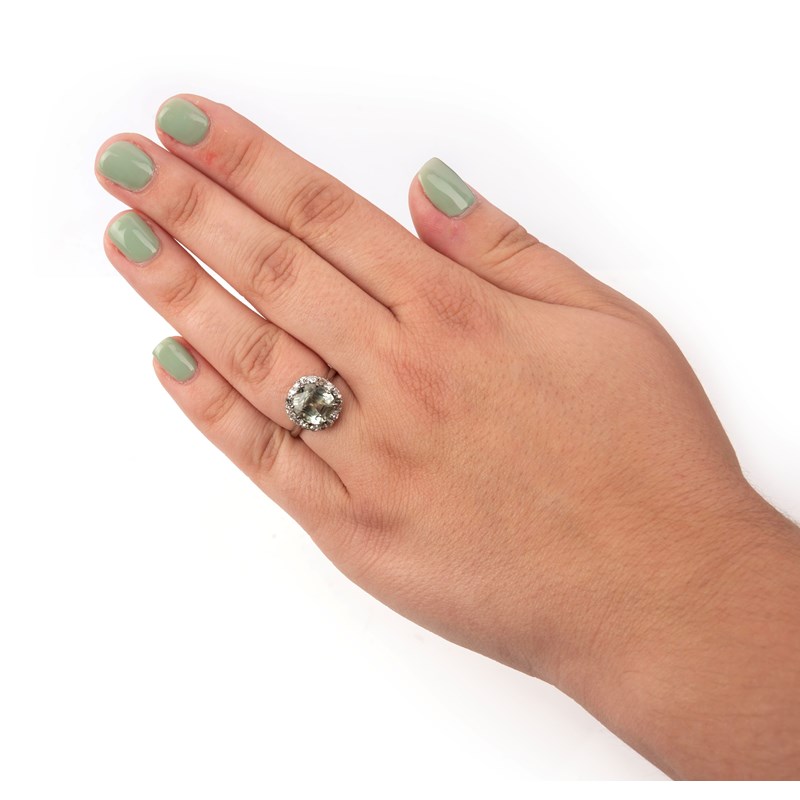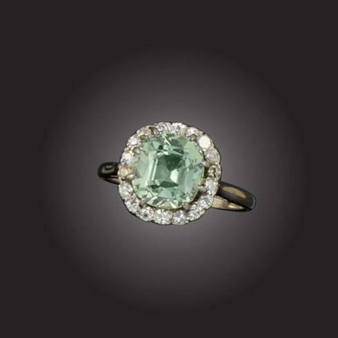 A green sapphire and diamond ring, the cushion-shaped green sapphire set within a surround of old cushion-shaped diamonds in platinum and white gold, size L, case