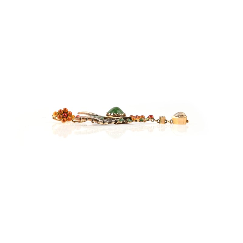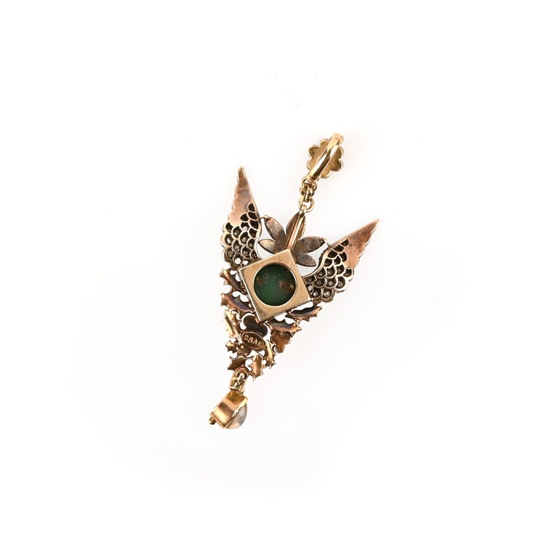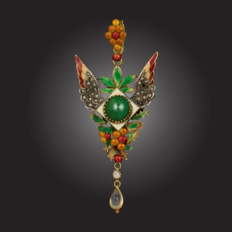 Carlo and Arthur Giuliano, an enamel and gem-set wings pendant, the stylised diamond-set wings (some diamonds missing) centring on a turquoise cabochon within enamel surround, with further polychrome enamel decoration and suspending a moonstone cabochon in gold, maker's plaque to reverse, length 5.2cm