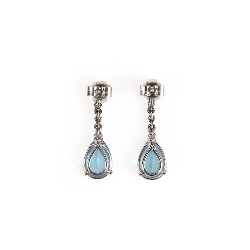 A pair of aquamarine and diamond drop earrings, the pear-shaped aquamarines suspended from three small diamonds in rub-over settings and topped with a stylised rose, set with a central diamond in white gold, post and butterfly fittings, length 2.6cm